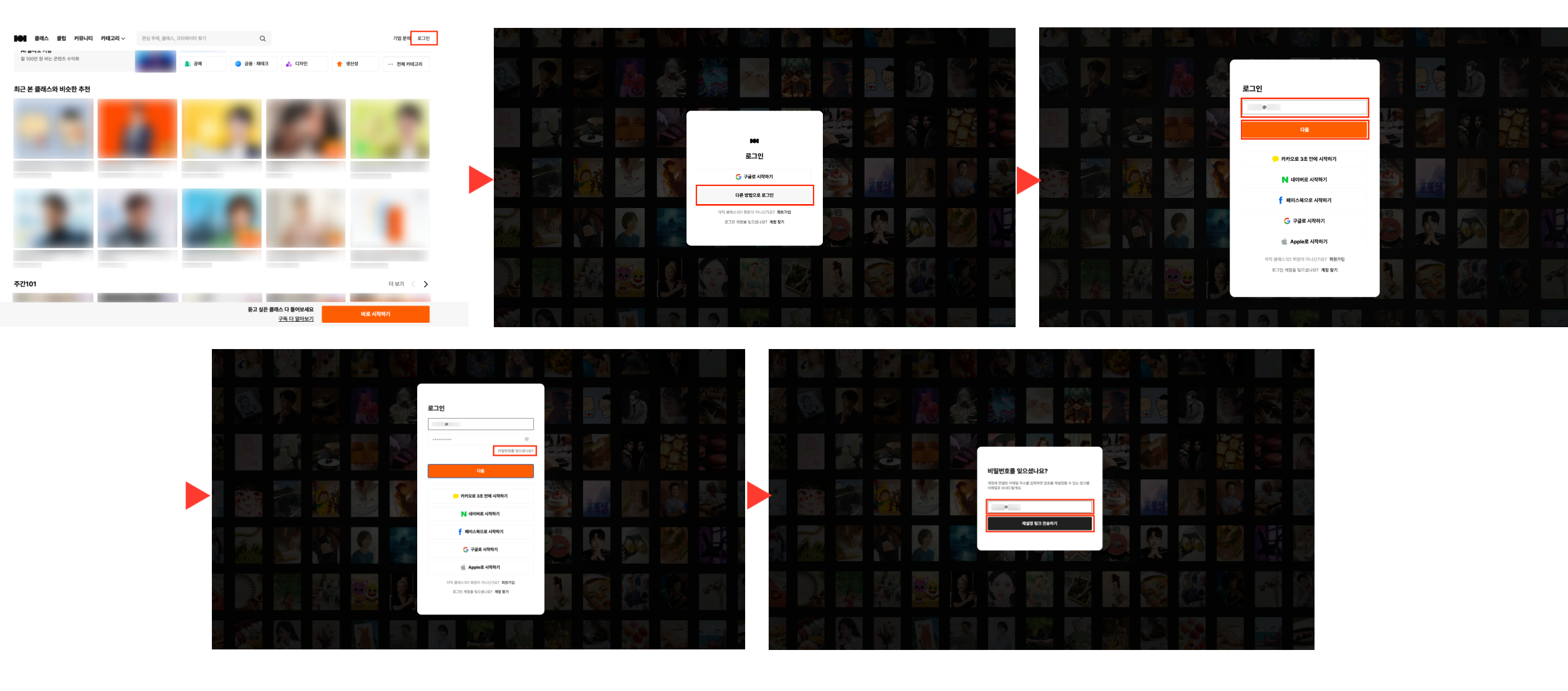 [클래스101 웹사이트 > 로그인(우측 상단) > '다른 방법으로 로그인' 클릭 > 이메일 입력 후 ‘다음’ 클릭 > ‘비밀번호를 잊으셨나요?’ 클릭 > 계정에 연결된 이메일 입력 > ‘재설정 링크 전송하기’ 클릭]