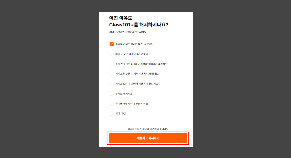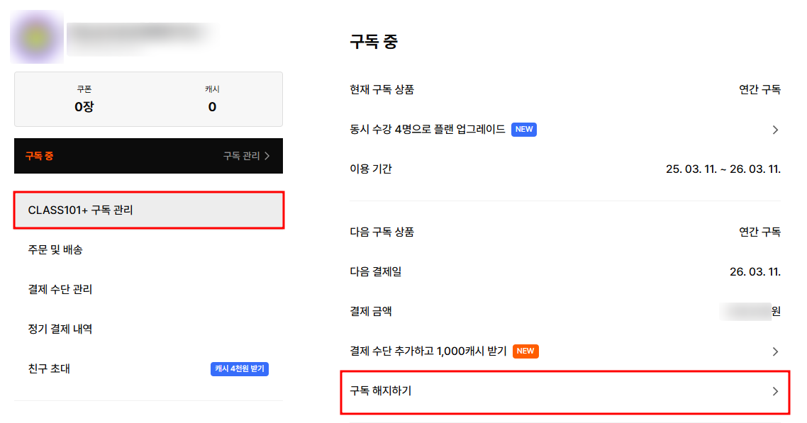 [로그인 > 마이페이지(우측 상단 프로필 클릭) > CLASS101+구독관리 > 구독 해지하기 > 해지하기 > 해지 이유 선택 > 해지하기]