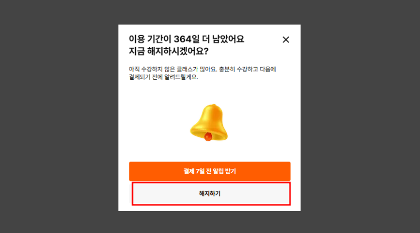 '해지하기'는 환불과 다르며, 다음 결제일에 추가 결제가 되지 않도록 설정하는 방법입니다. 해지를 신청하더라도 남은 기간 동안 서비스는 계속 이용하실 수 있습니다.