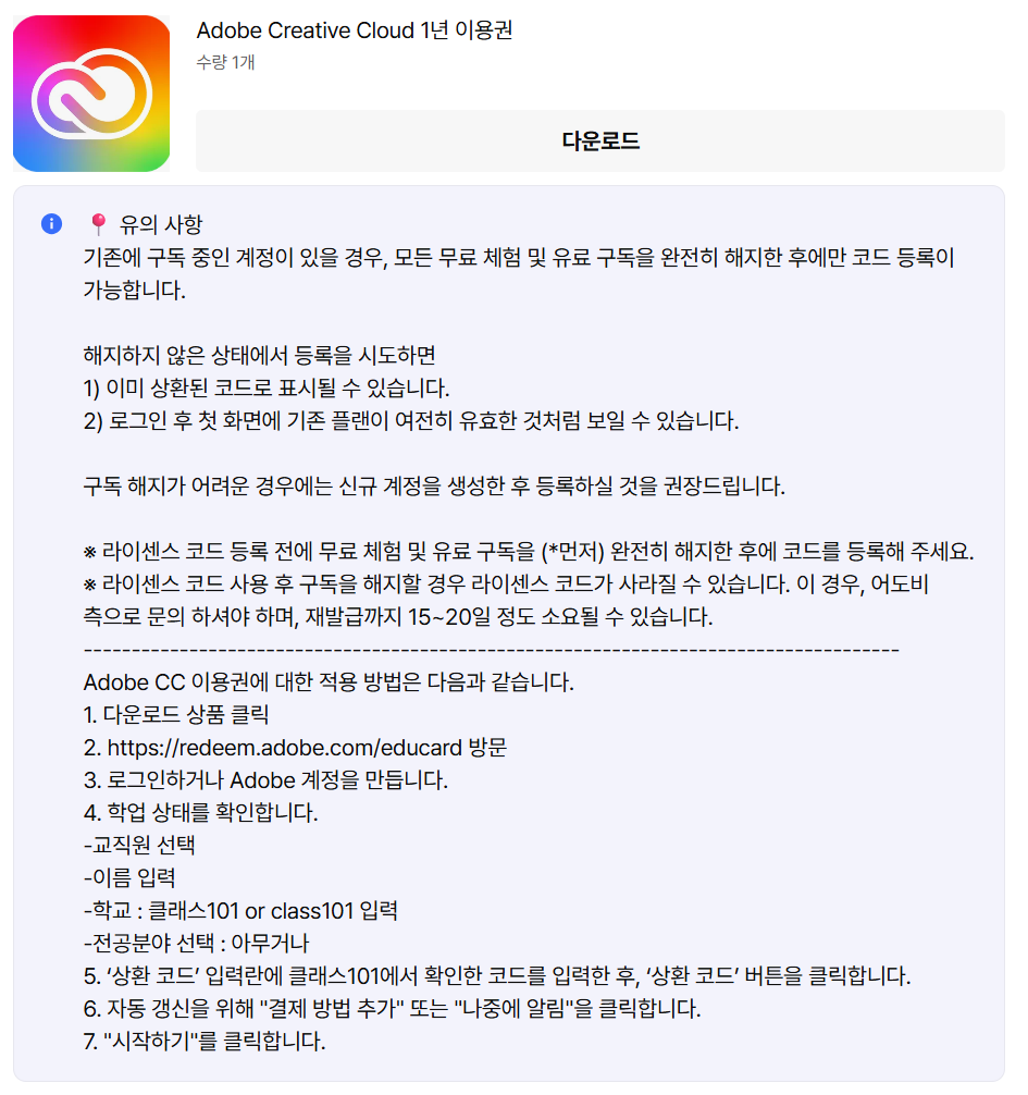Adobe 이용권 코드의 재판매 행위는 엄격히 금지되어 있으며, 처벌 대상인 점 유의 부탁드립니다.