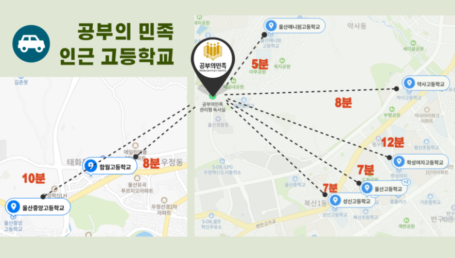 공부의민족 관리형 스터디카페는 백양사 사거리에 위치하고 있어요. 울산경찰청 버스정류장 바로 앞 건물이라 하교 후 버스타고 오기 너무 좋답니다!