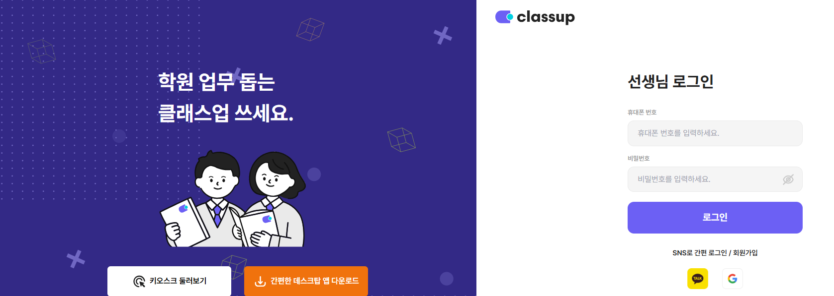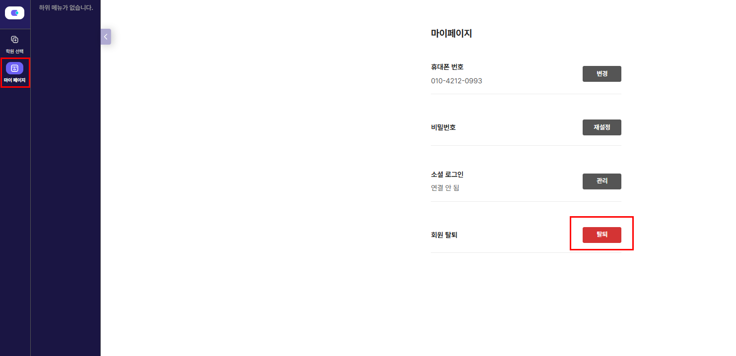 STEP 1. 클래스업 로그인 페이지 접속하기https://academy.classup.io/login/STEP 2. 탈퇴 진행하기마이 페이지에 들어가 탈퇴를 진행해 주세요!학원 선택 페이지에서는 생성했던 학원을 삭제할 수 있습니다.