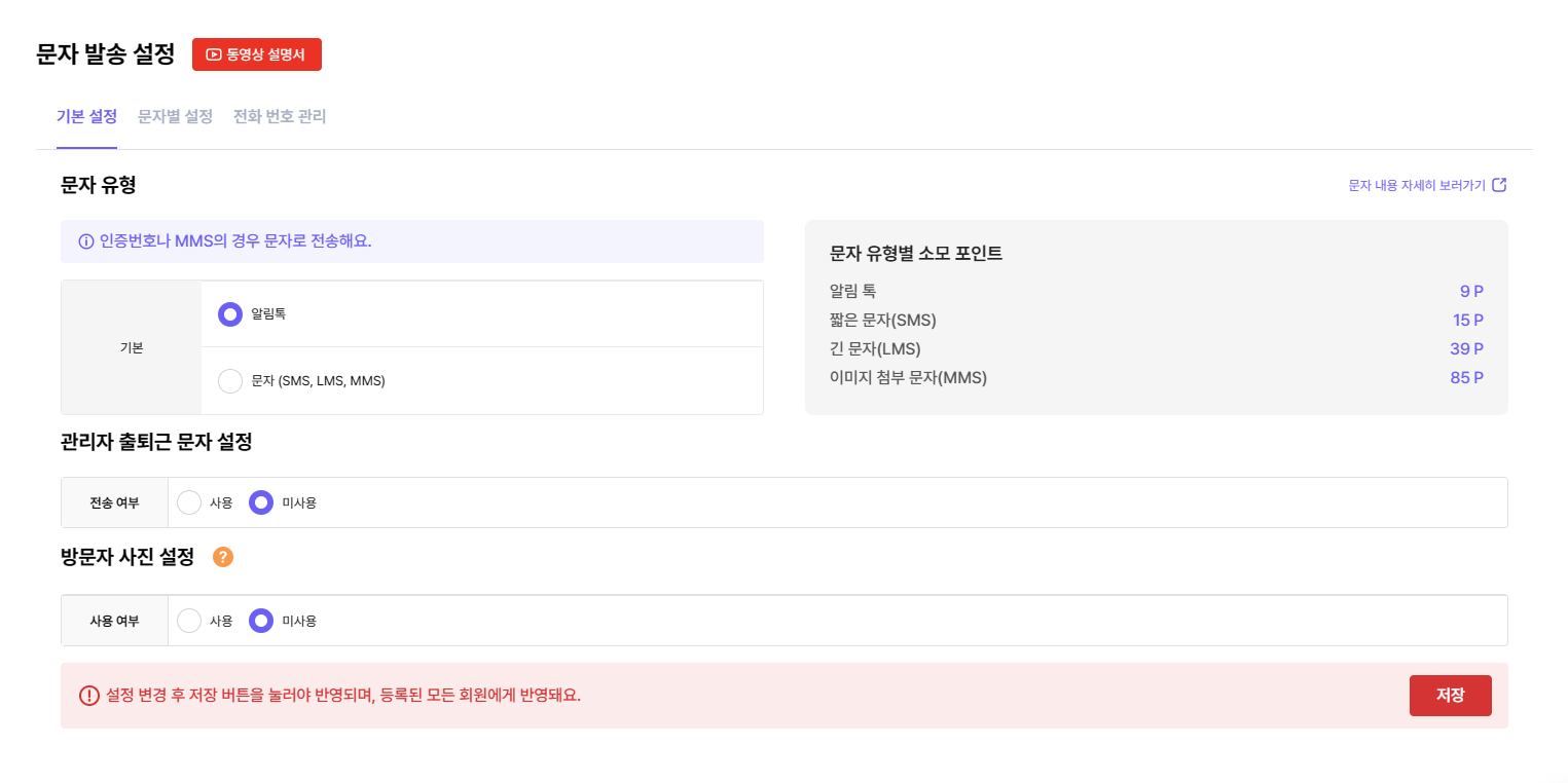 관리자 출퇴근 문자 설정: 일반관리자가 출퇴근 할 때 문자 발송 여부를 설정합니다.