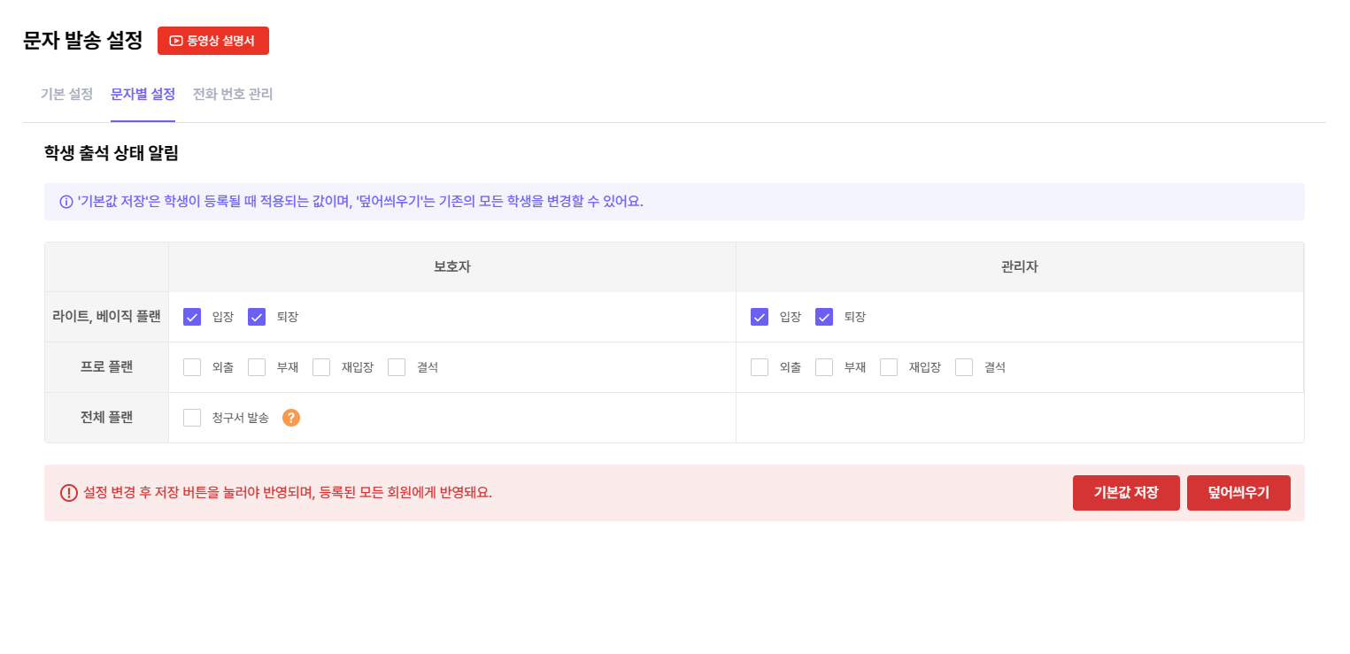 보호자와 관리자에게 보낼 출결 문자를 지정할 수 있습니다.