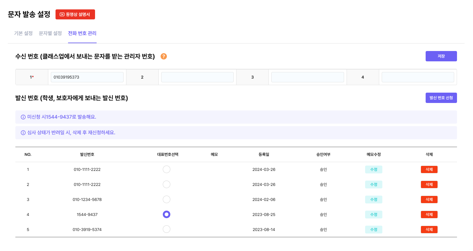 발신 번호: 학생 및 보호자에게 발송되는 문자에 표시될 전화번호를 설정합니다.