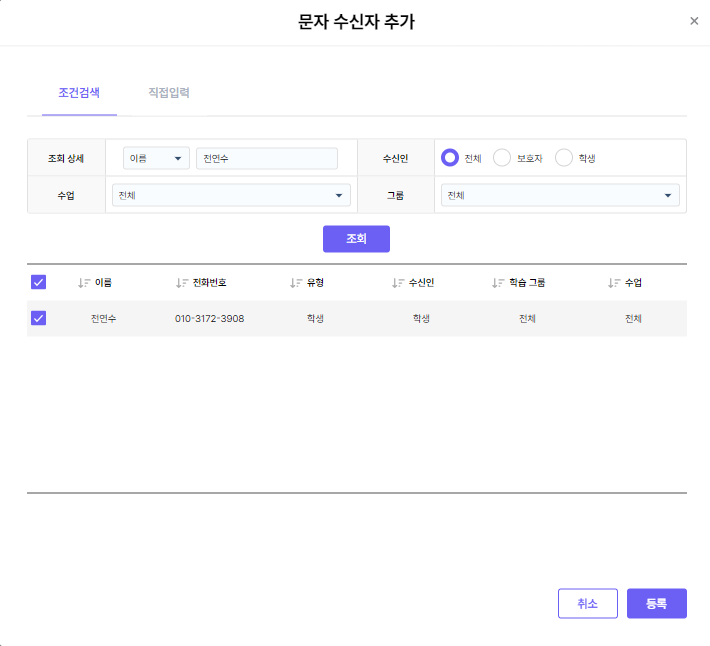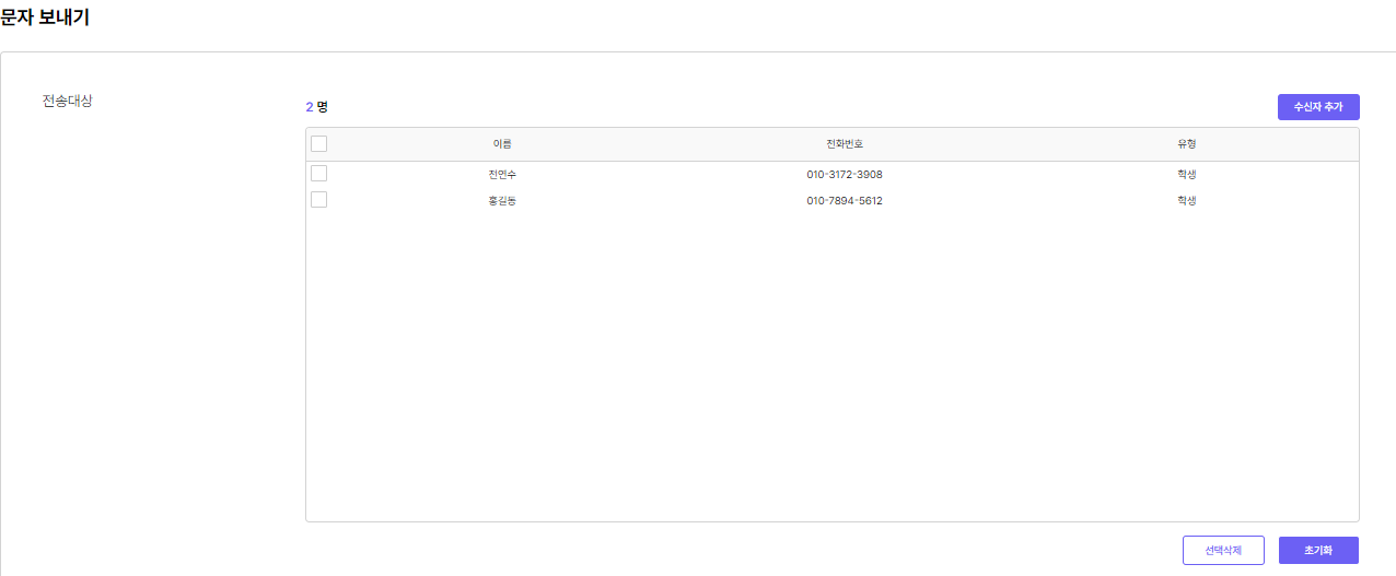 [문자보내기] 탭에서 [수신자 추가] 를 눌러, 문자 전송할 학생을 선택 할 수 있습니다.