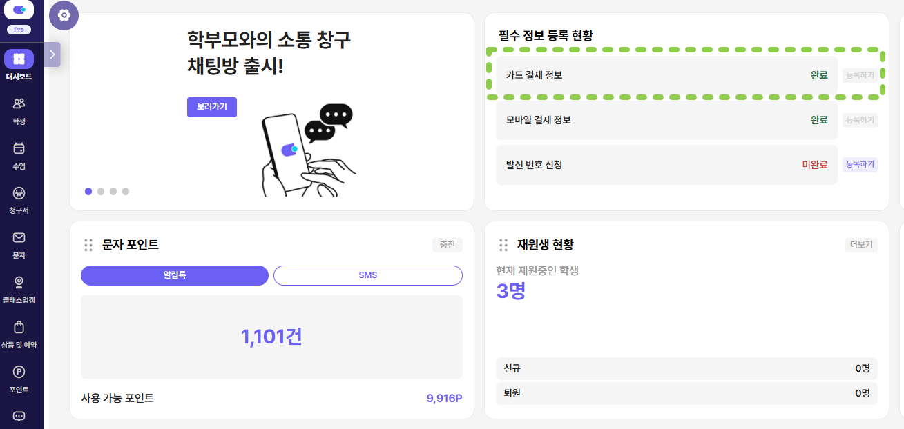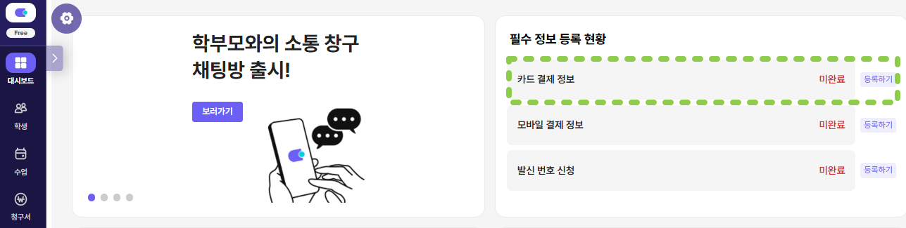 카드 결제 정보가 '미완료' 상태라면 등록하기 버튼을 눌러 심사를 신청해주세요