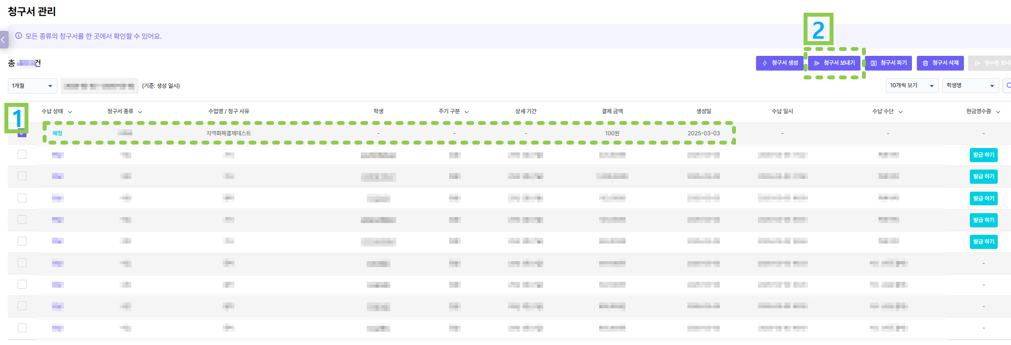 우측 상단의 '청구서 보내기' 클릭해주세요!