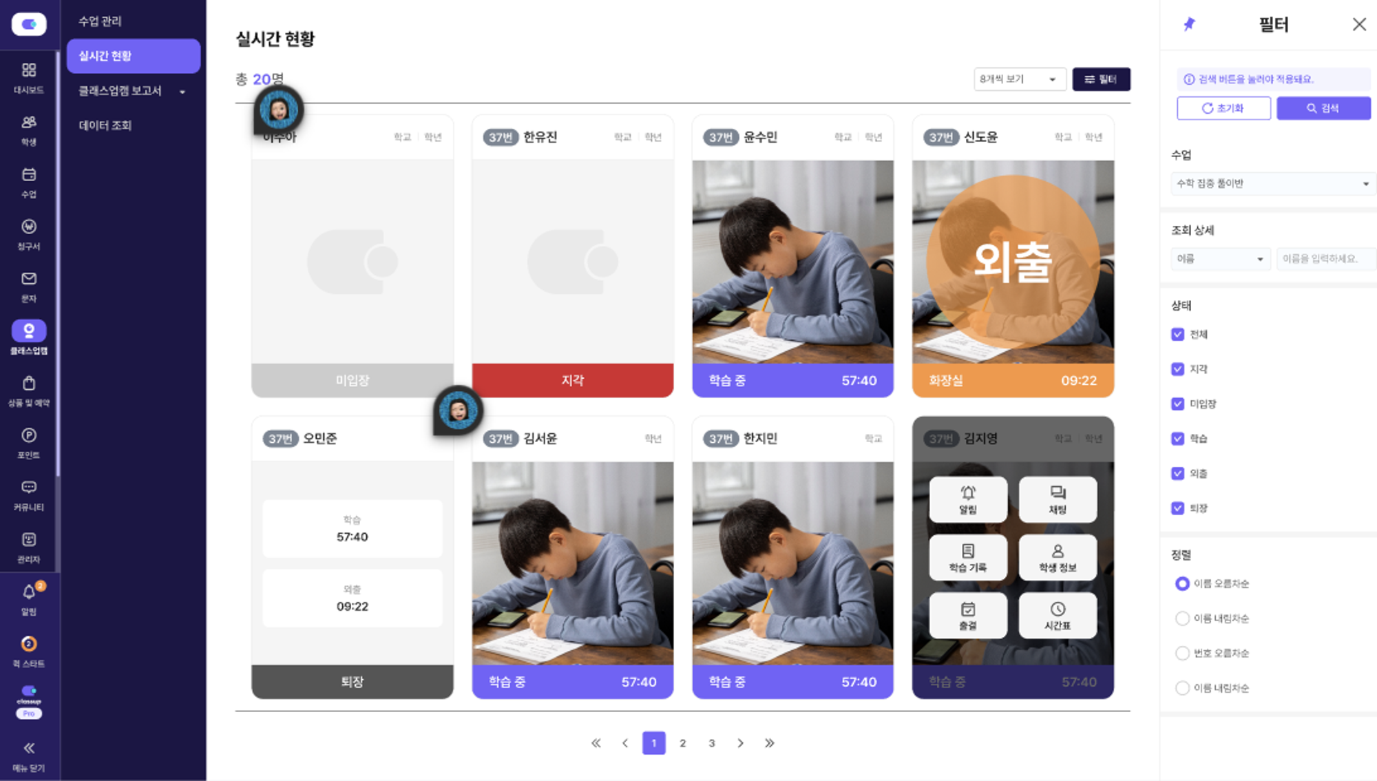 •학생의 사진에 마우스를 올려보면 여러가지 추가적인 기능을 사용할 수 있습니다.