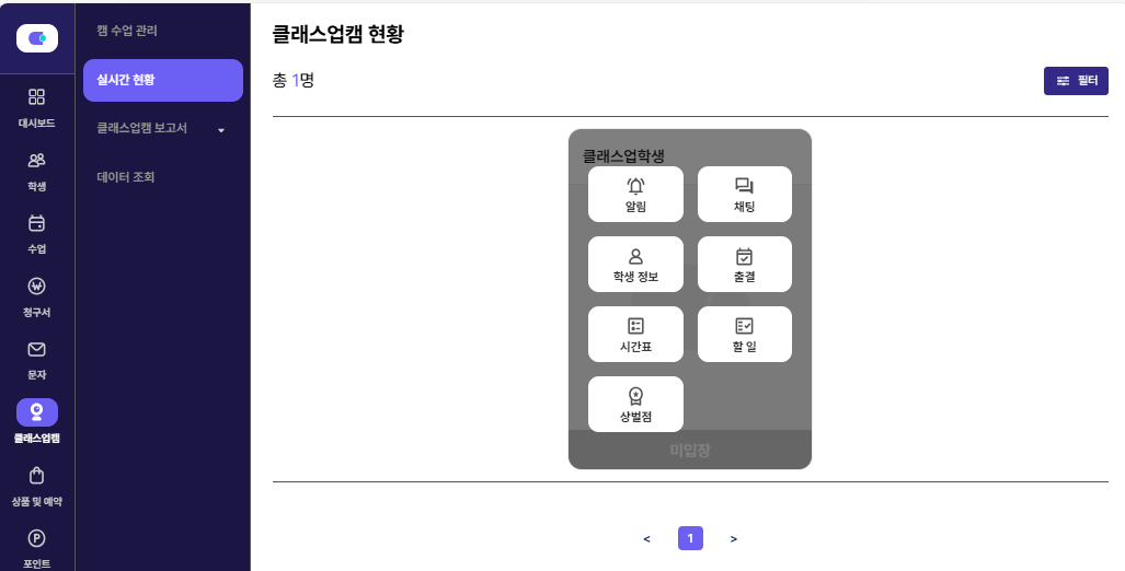 실시간으로 연동되어 있으며, 학생이 휴대폰으로 입장할 경우 셀프카메라가 자동으로 작동하며 10초에 한 번씩 촬영된 사진을 확인 할 수 있습니다.