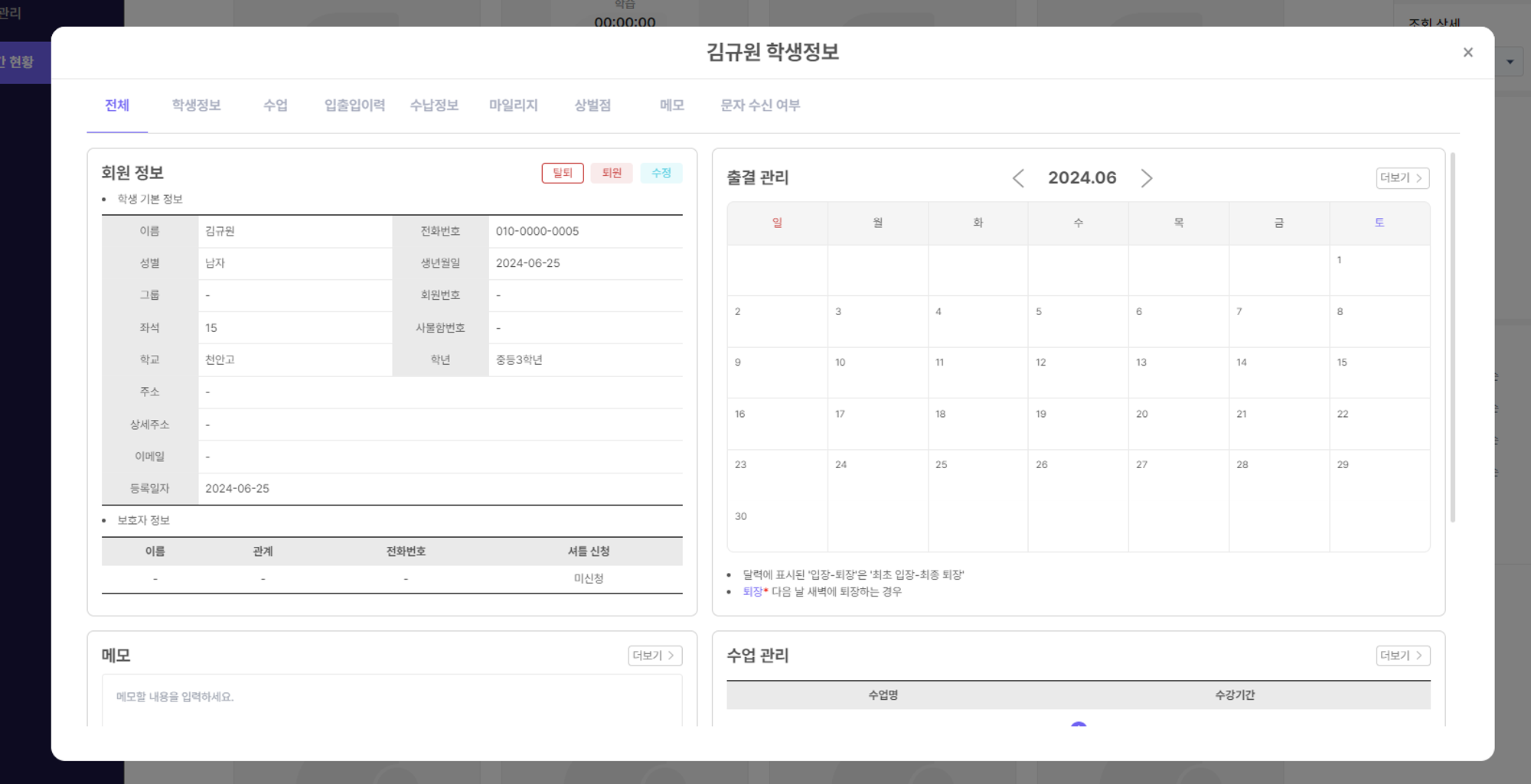 관리자페이지의 [학생] 메뉴에서 사용하던 학생 정보와 동일한 기능입니다.