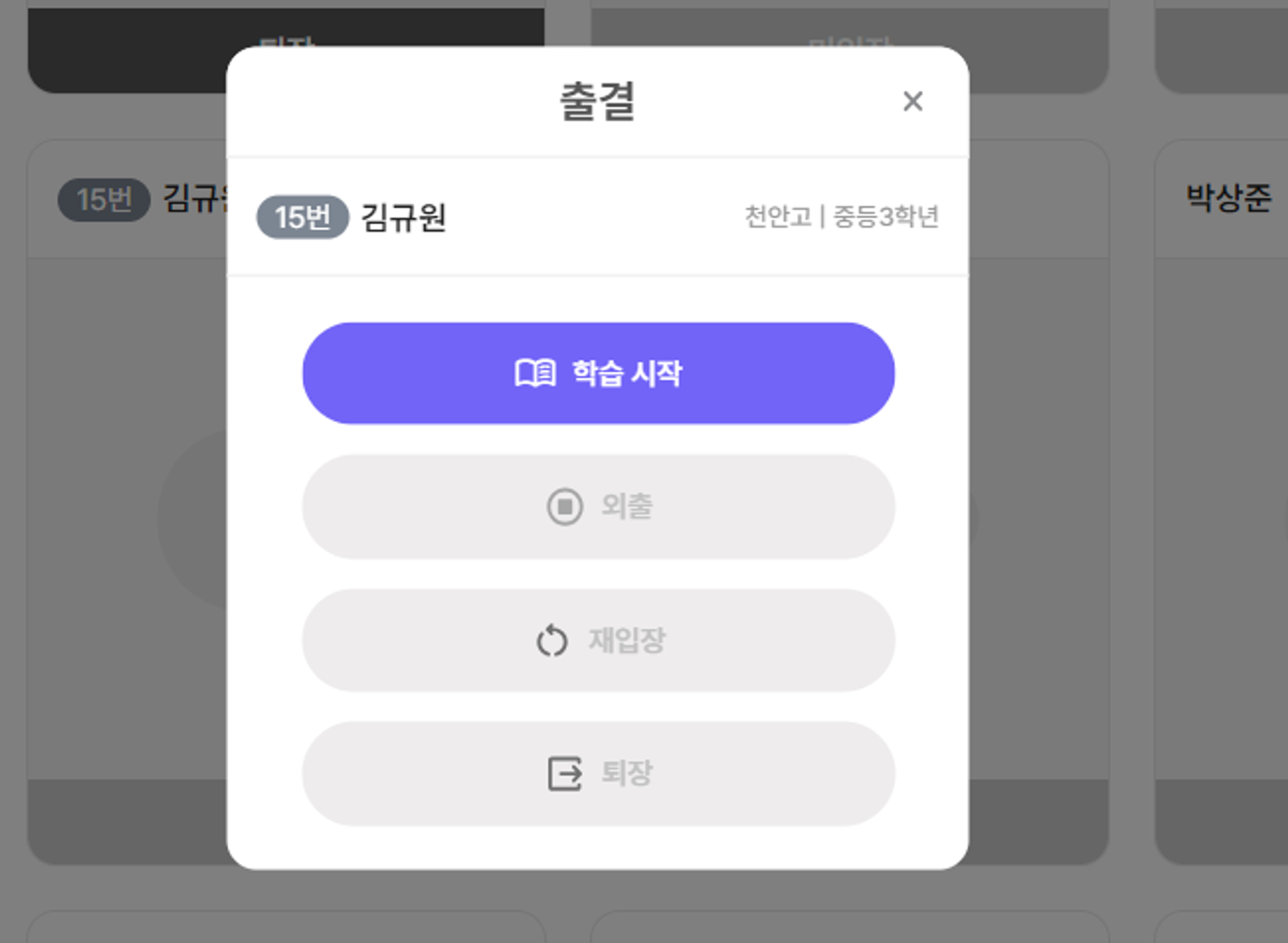 •퇴장 상태가 되면 그 날의 공부 시간과 누적 외출 시간이 계산됩니다.