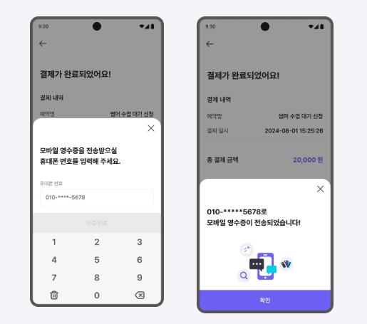 모바일 영수증 전송 클릭 시 전송할 대상의 전화번호를 입력하고 전송할 수 있어요.