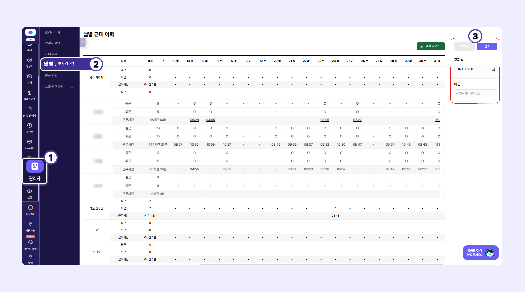 [관리자] > [월별 근태 이력]원하는 조건에 맞게 선생님들의 근태 내역을 확인 할 수 있습니다.