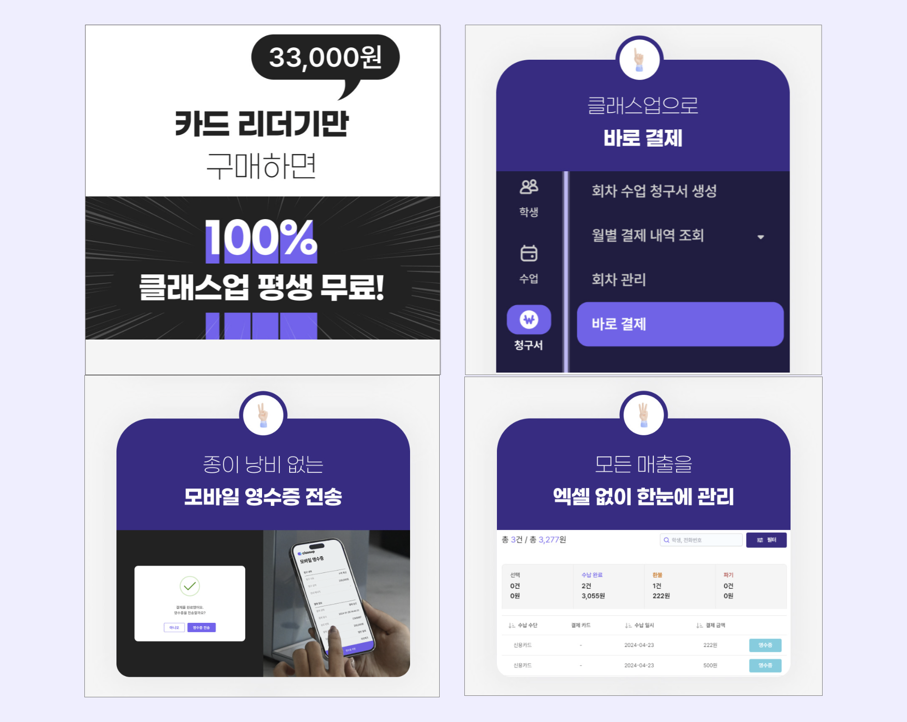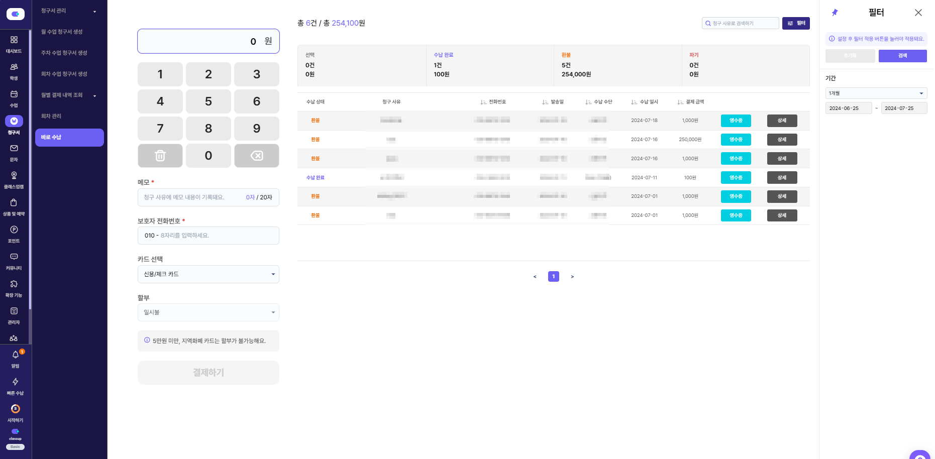 바로 결제 및 영수증 전송까지 가능하며, 매출 내역은 클래스업 프로그램과 연동되어 정산관리까지