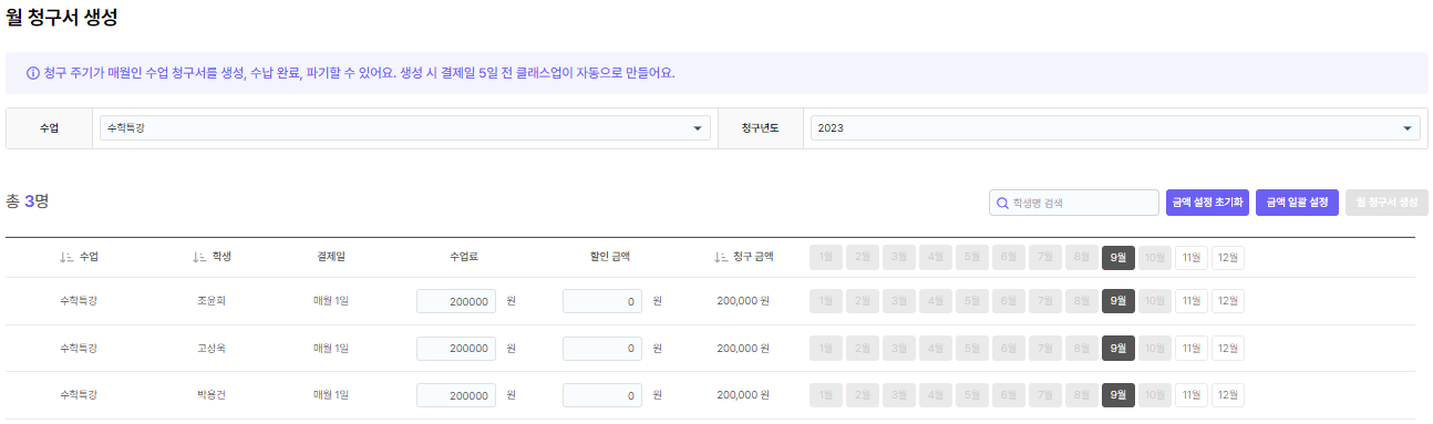 청구 주기가 “매월”인 수업 청구서를 생성/수납/파기할 수 있습니다.