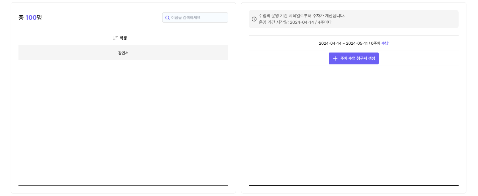 [수업목록] > [학생이름]을 클릭하시면 우측에 미납건이 확인이 가능하며 회차 청구서를 추가 할 수 있습니다.
