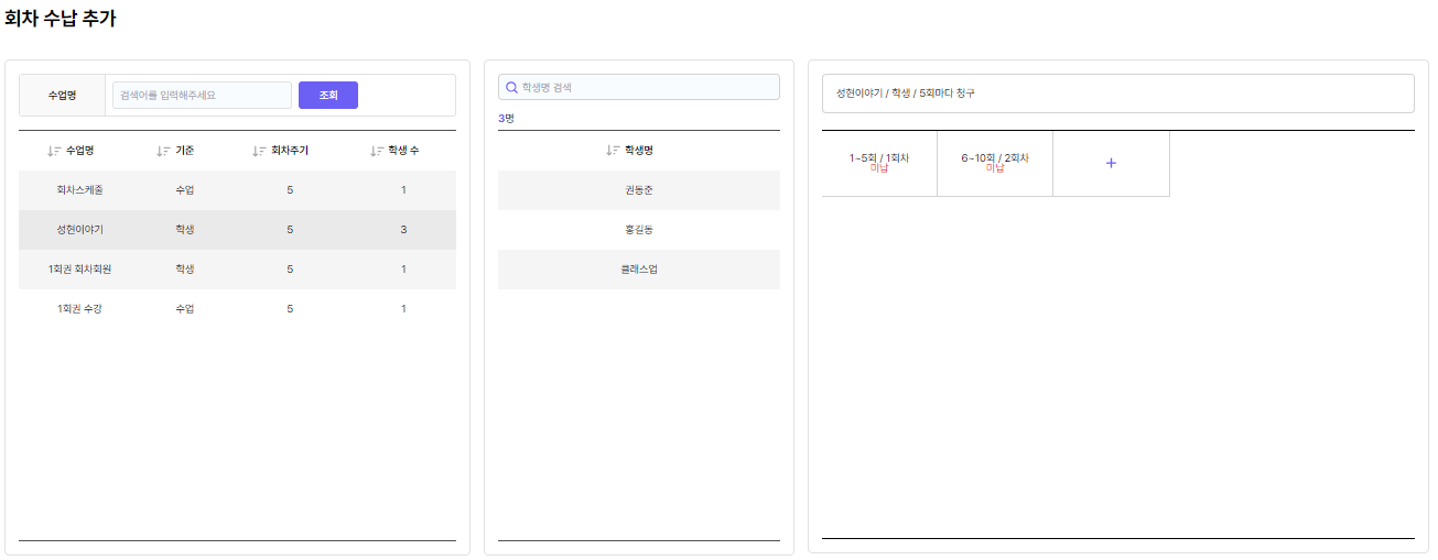 [수업목록] > [학생이름]을 클릭하시면 우측에 미납건이 확인이 가능하며 수납 회차 추가 할 수 있습니다.