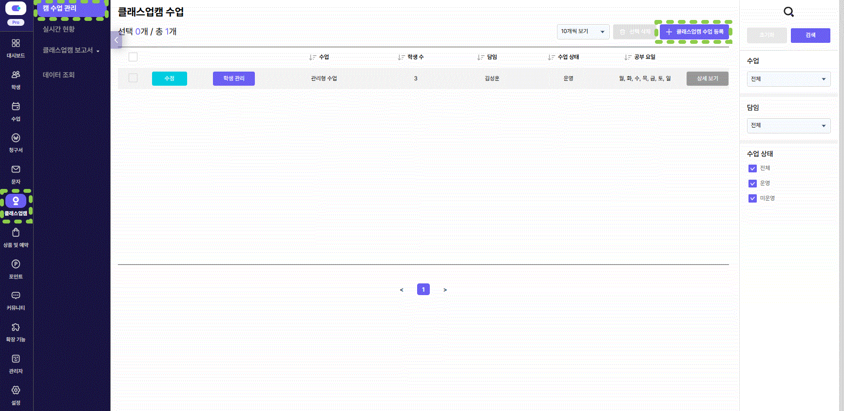 [클래스업캠] → [캠 수업 관리] → 우측 상단 [클래스업캠 수업 등록]