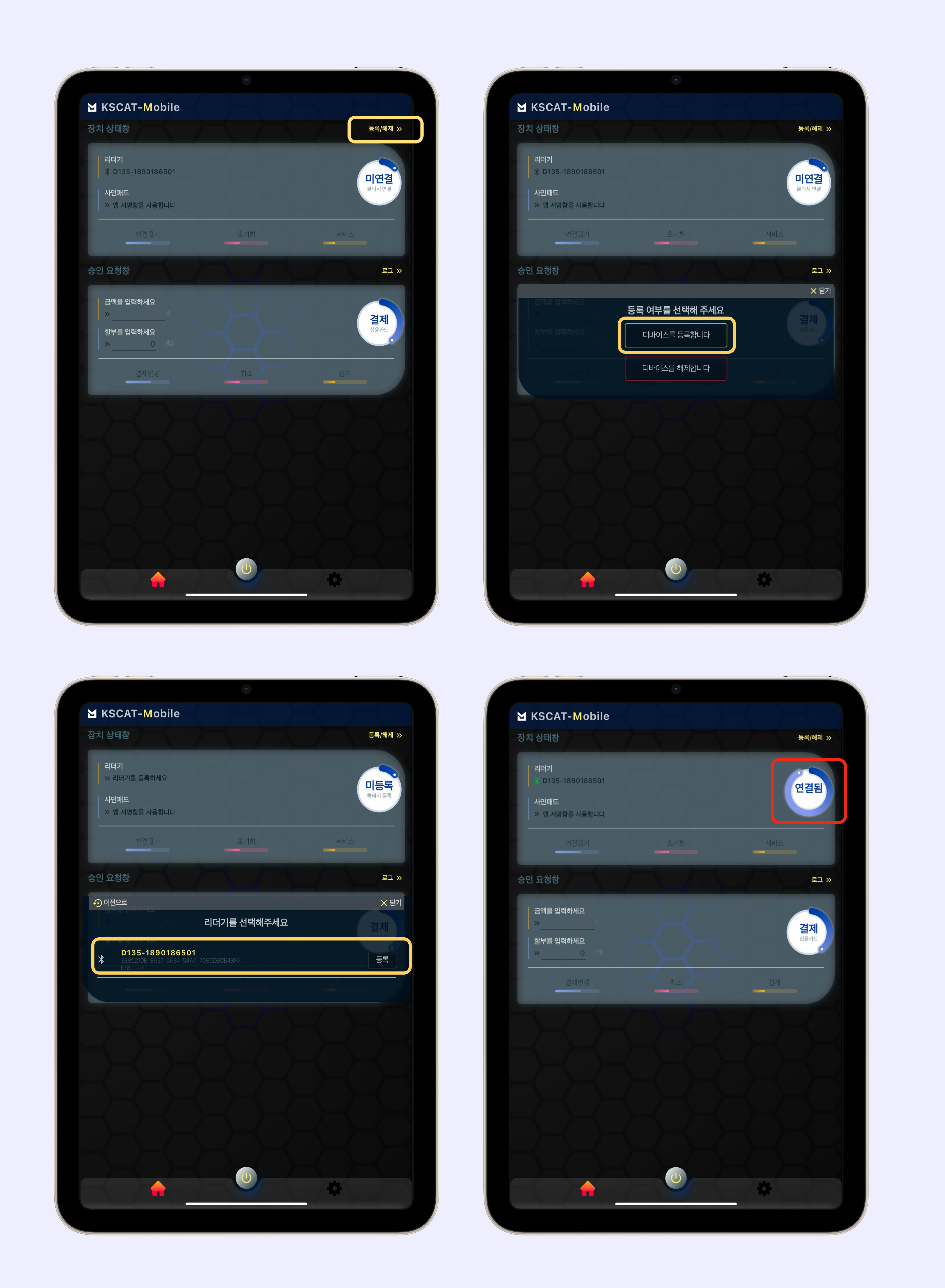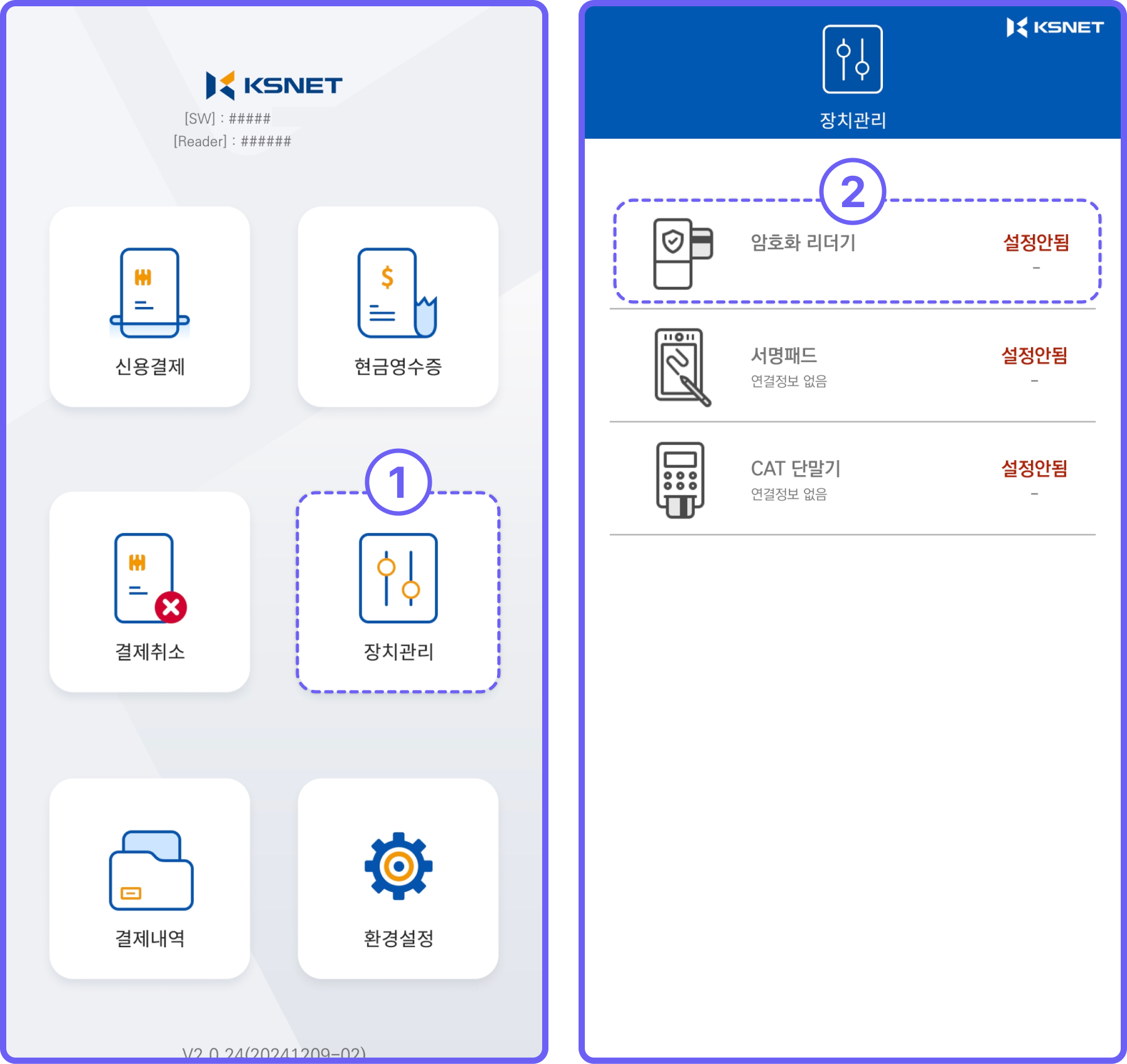 KSCAT 어플 실행 → [장치 관리] 클릭 > [암호화 리더기] 클릭