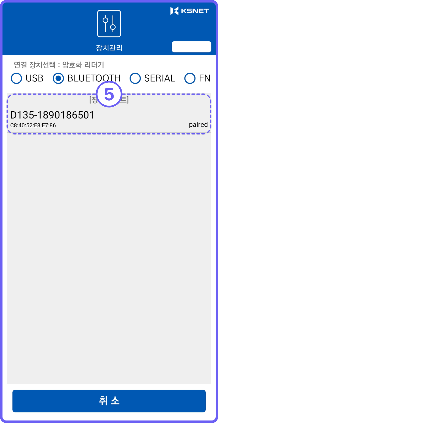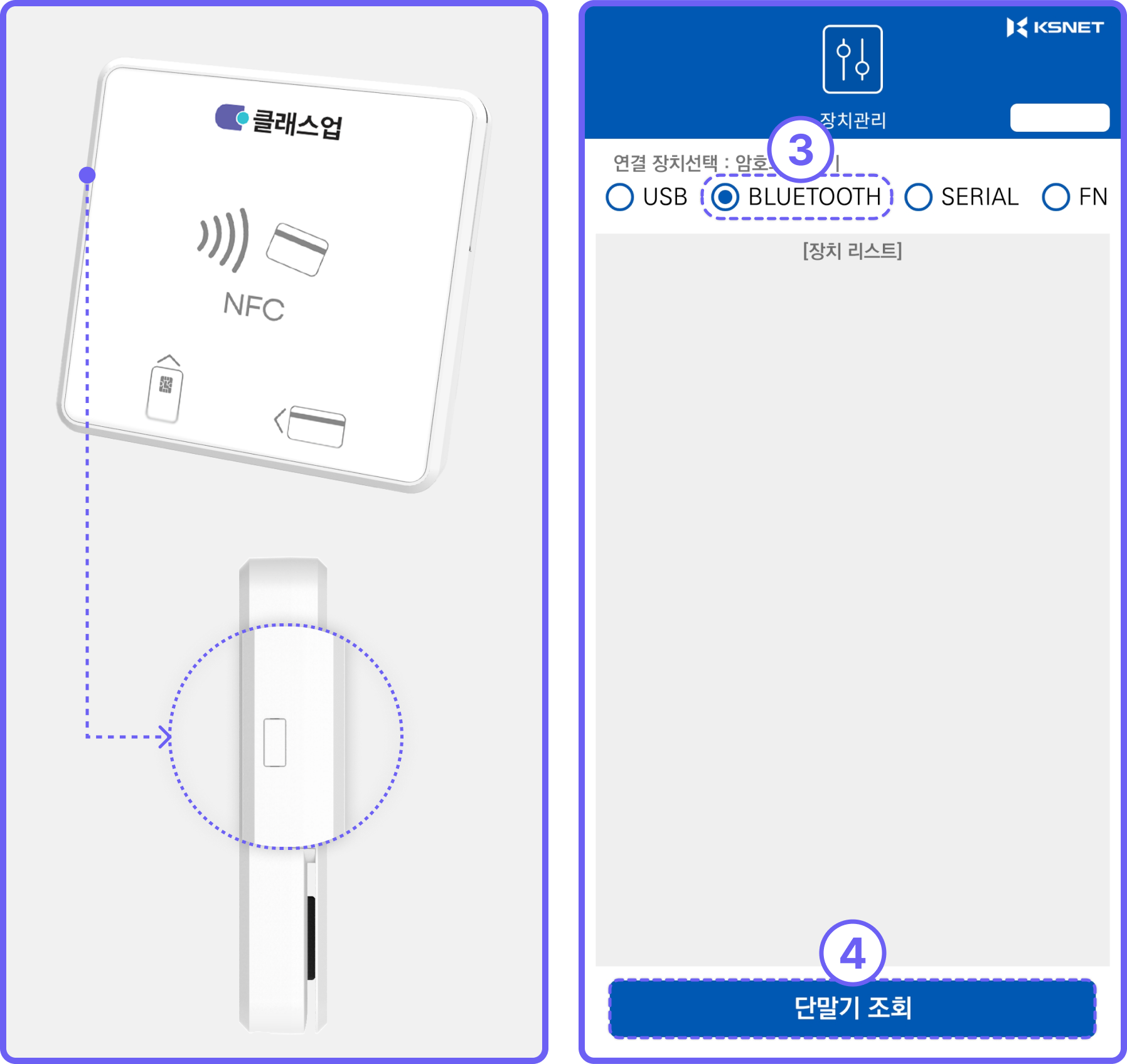 BLUETOOTH를 체크합니다.단말기 조회버튼 클릭합니다.