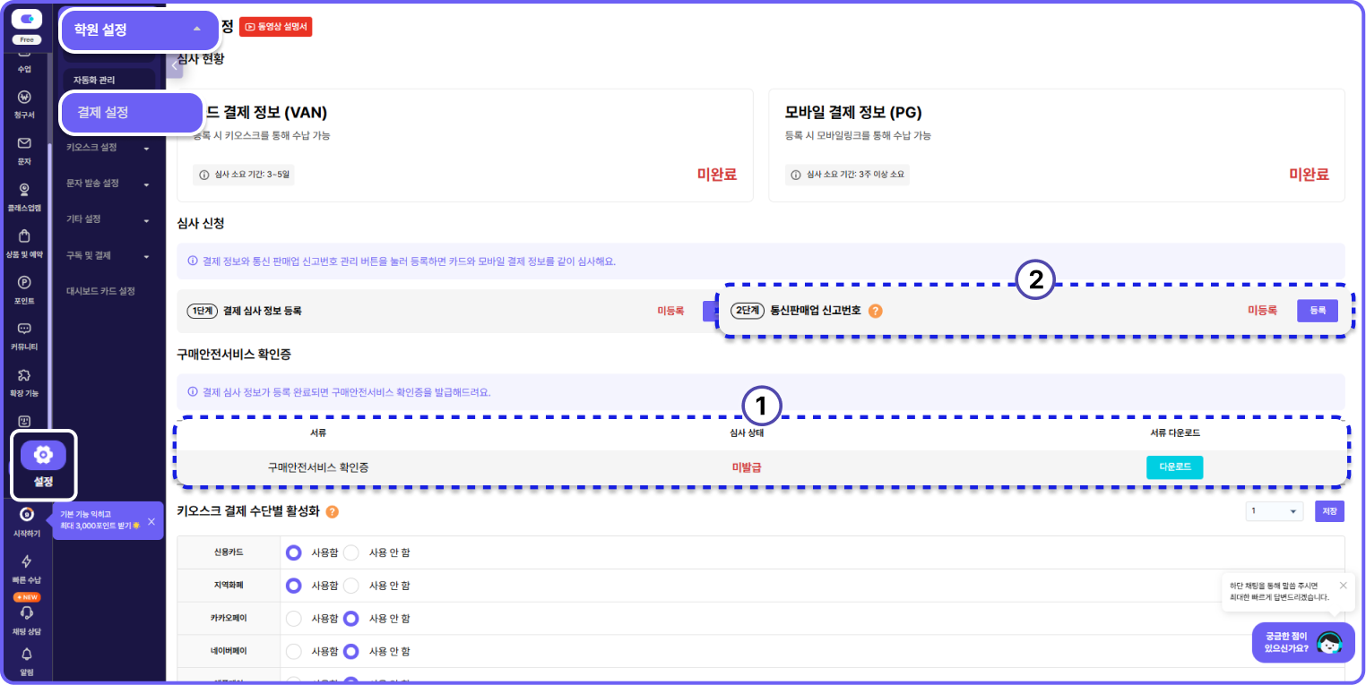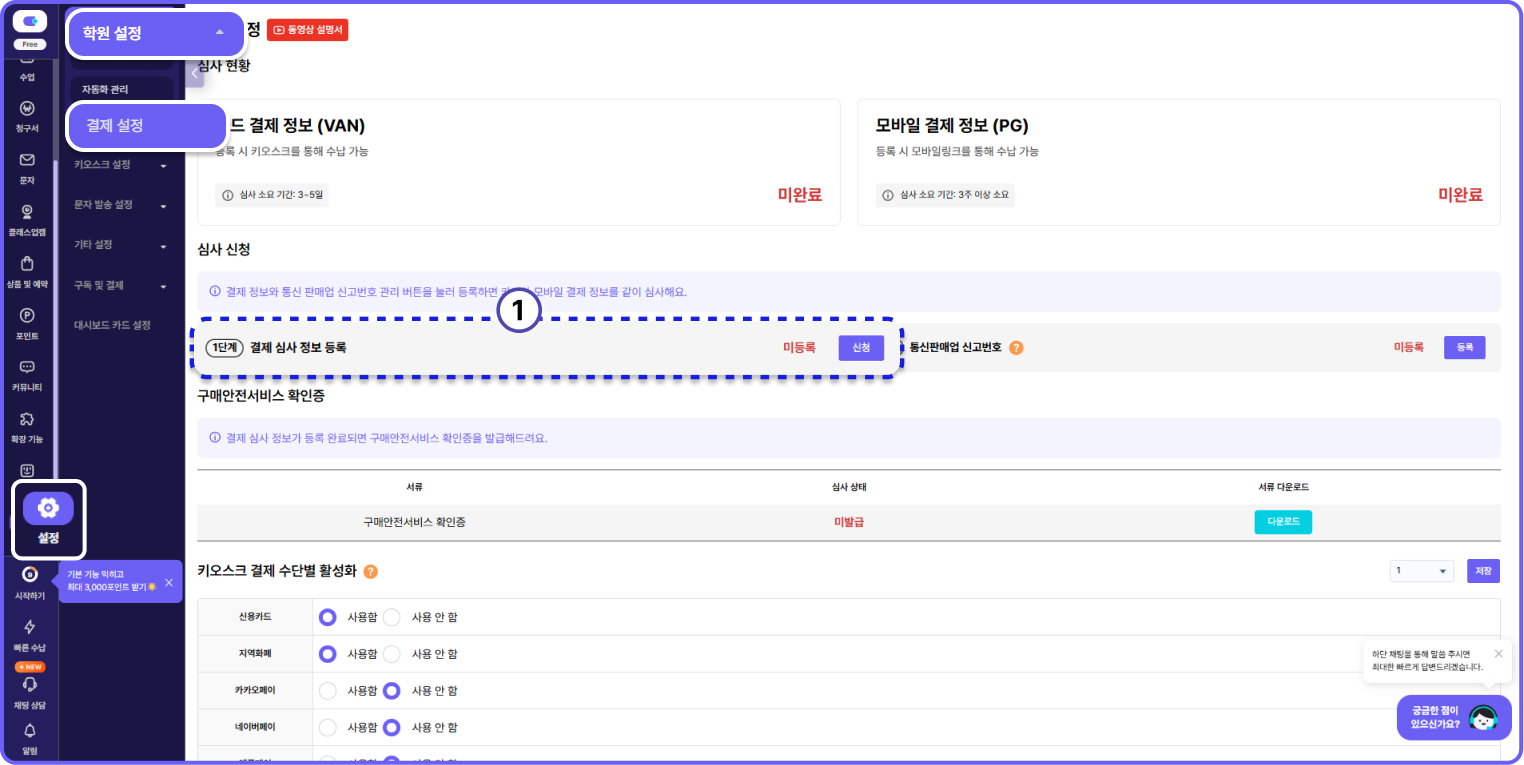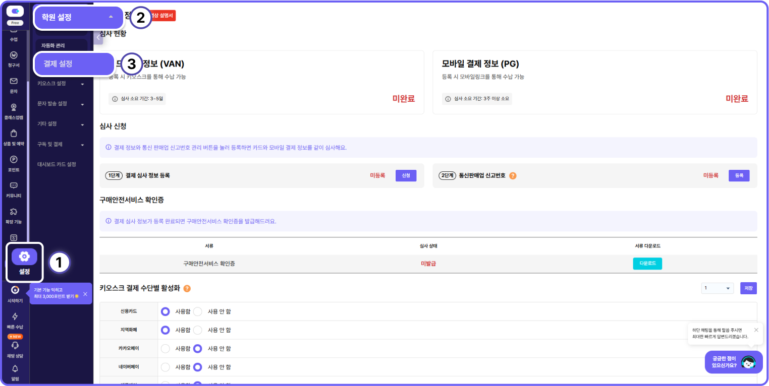 서비스 위치 : 관리자페이지[설정] > [학원 설정] > [결제 설정]페이지로 이동합니다.