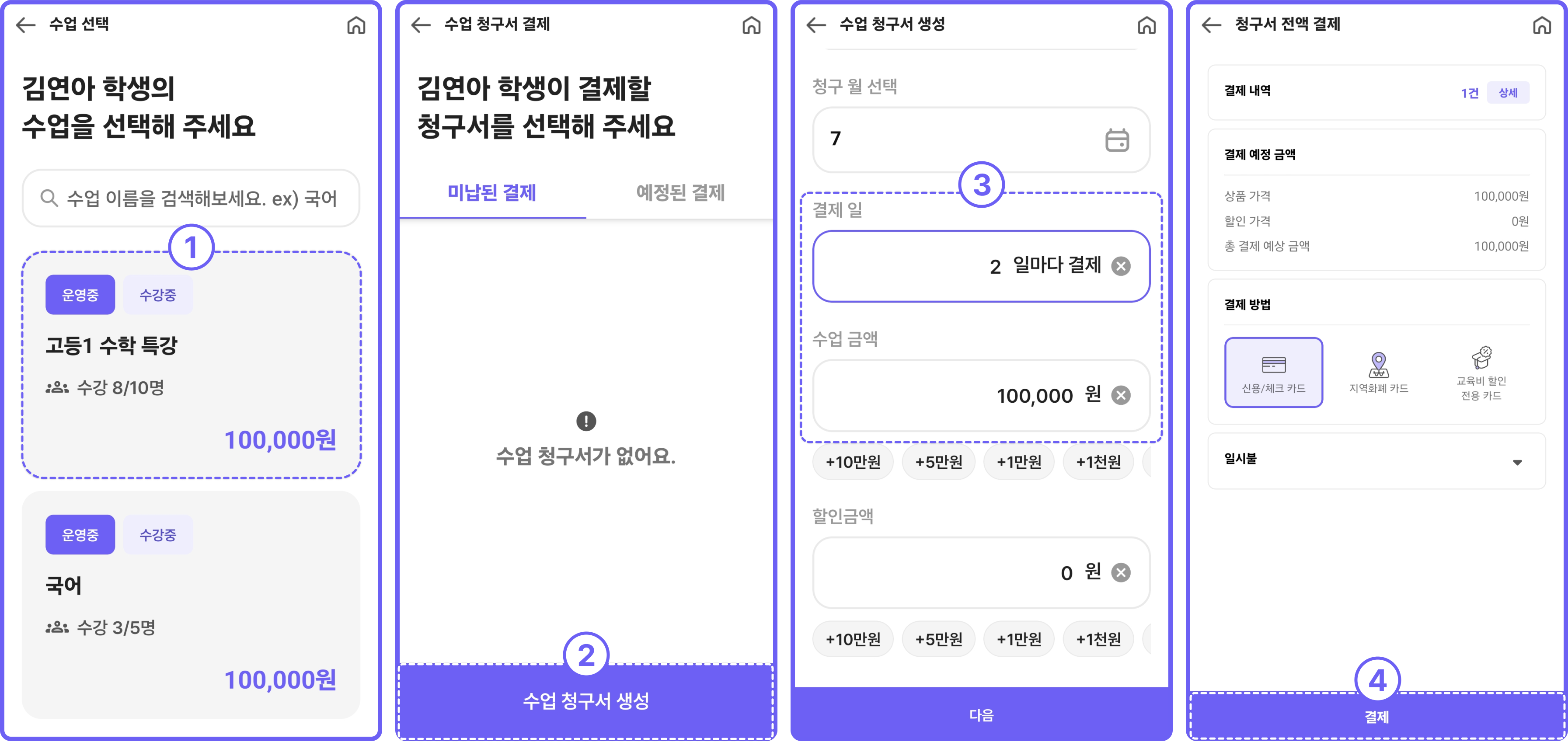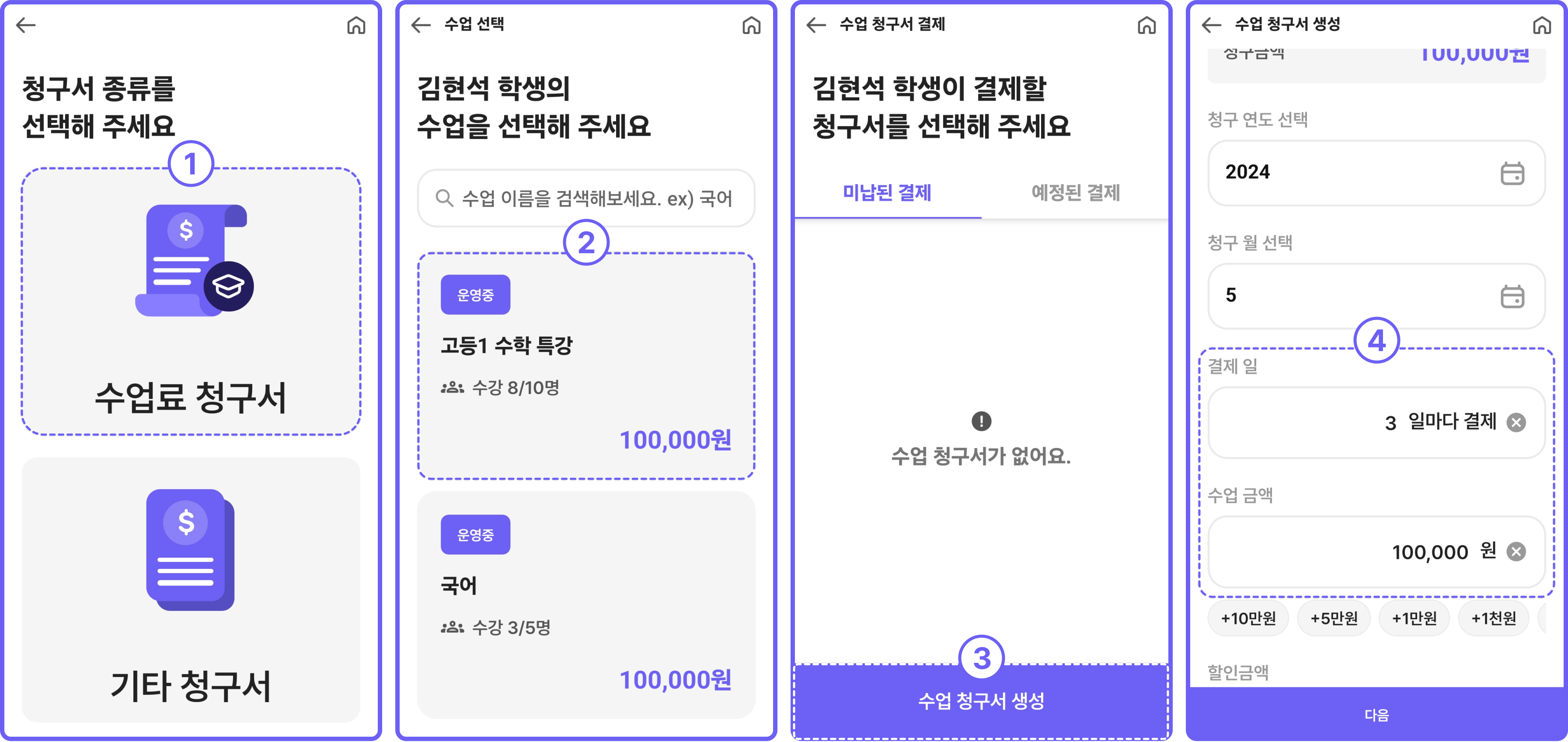 [수업료 청구서] → 수업 클릭 → [수업 청구서 생성] → 결제일, 수업 금액 설정 후 결제