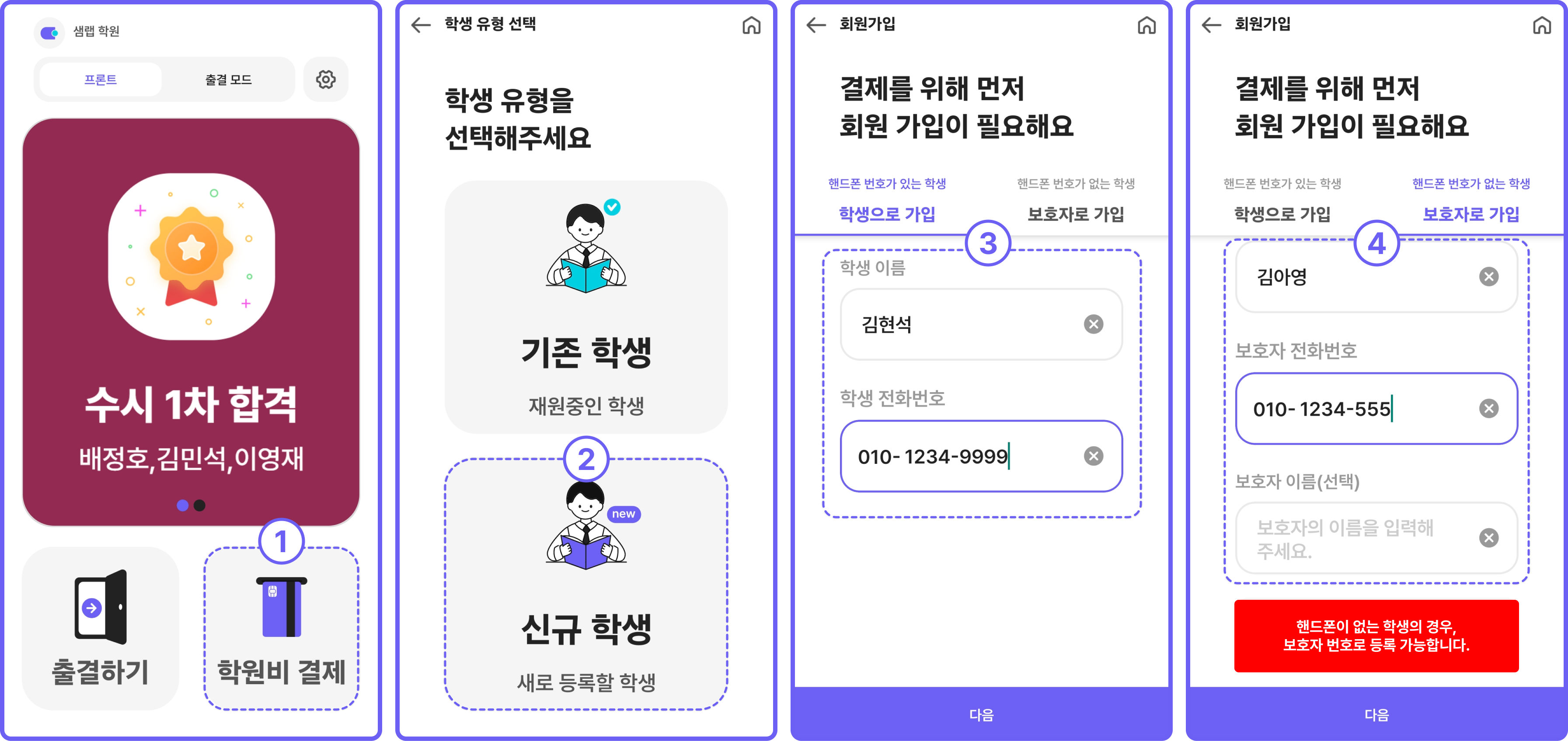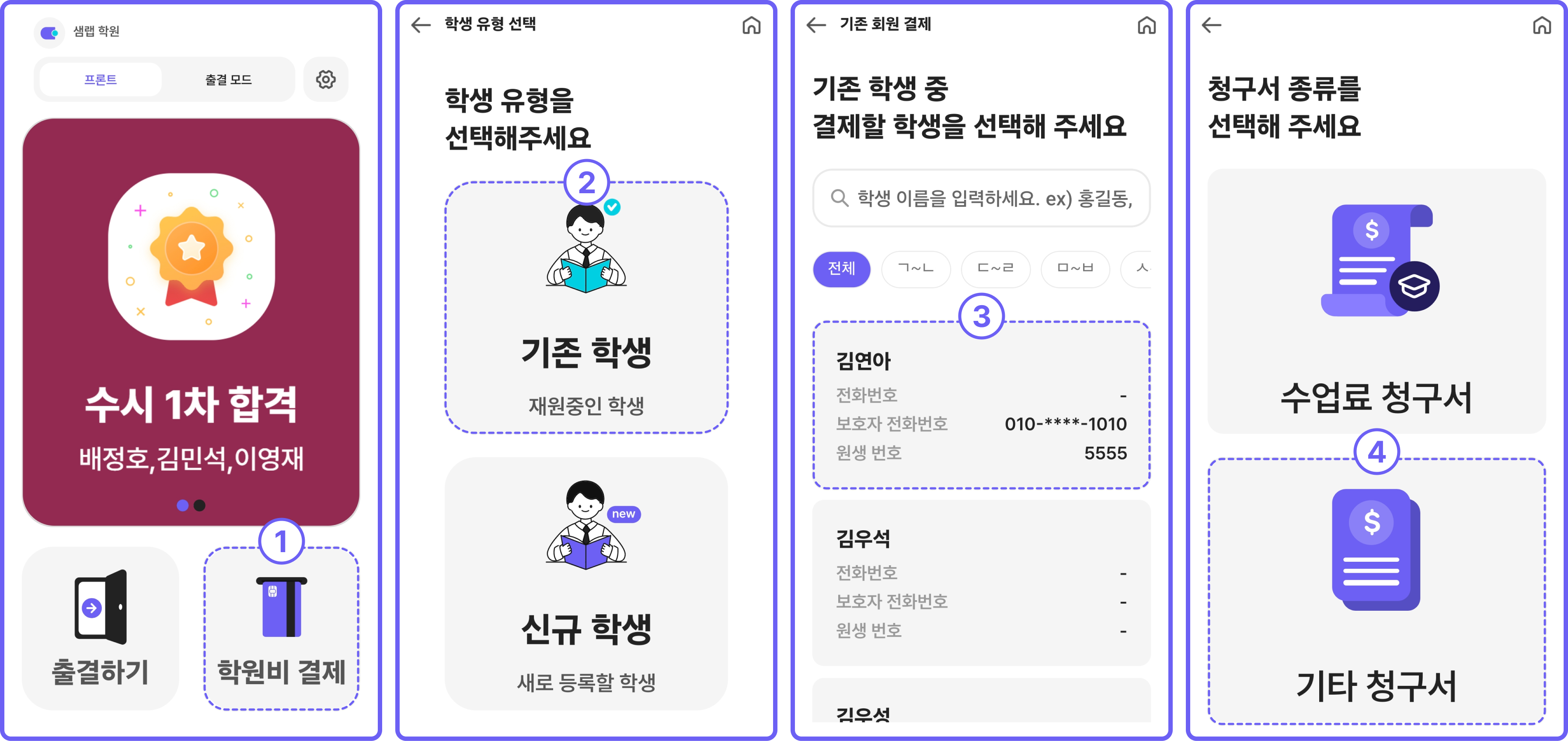 [학원비 결제] → [신규 학생] → 이름, 전화번호 등록