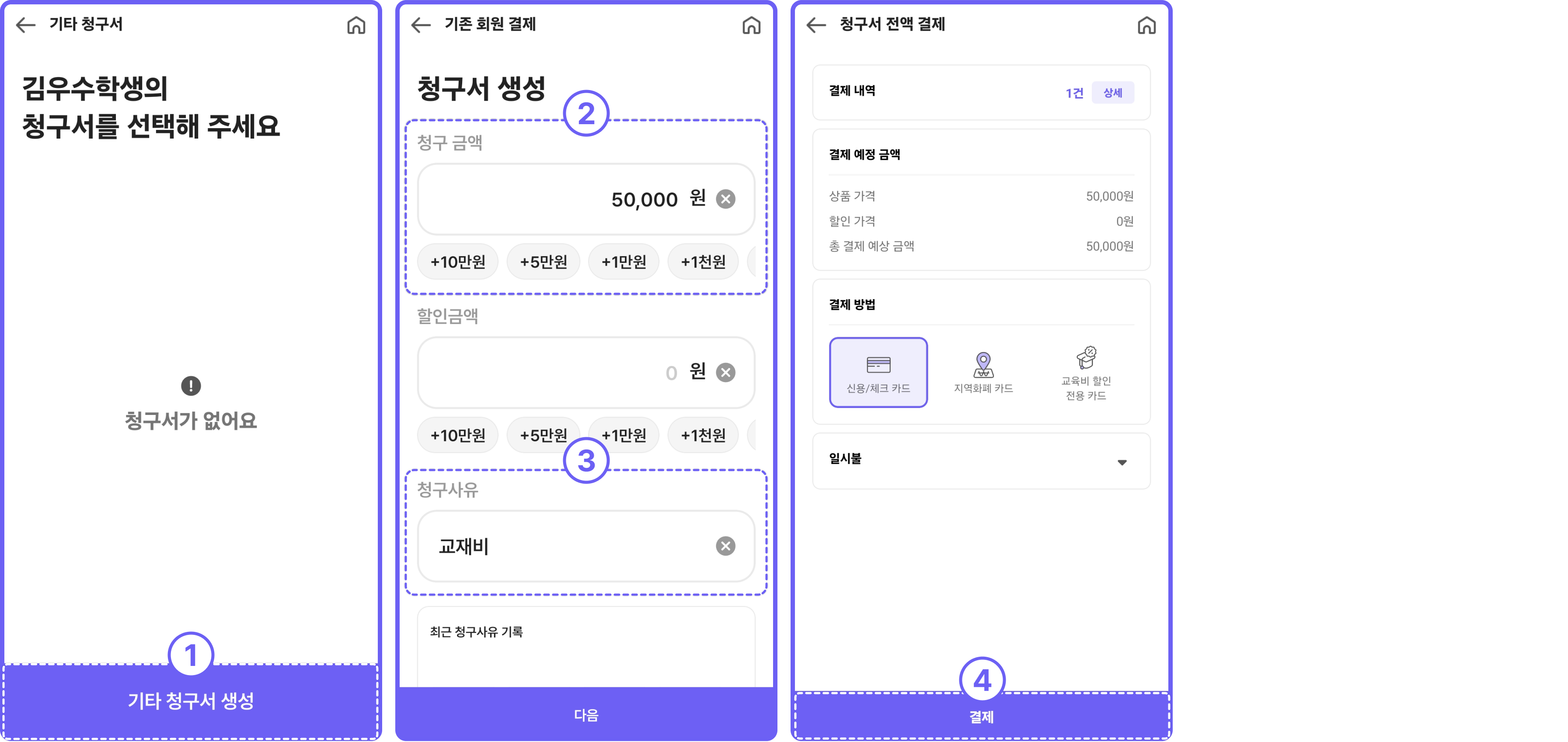 [기타 청구서 생성] → 청구 금액, 청구 사유 작성 → 결제