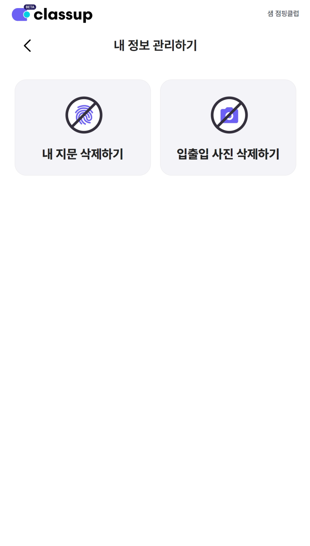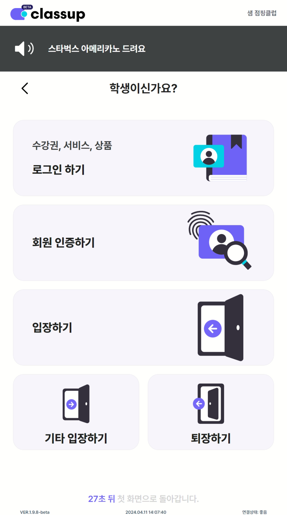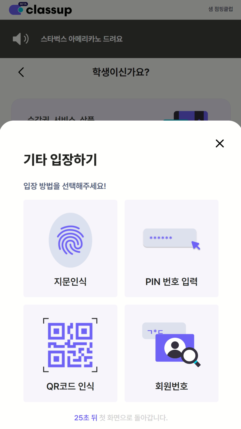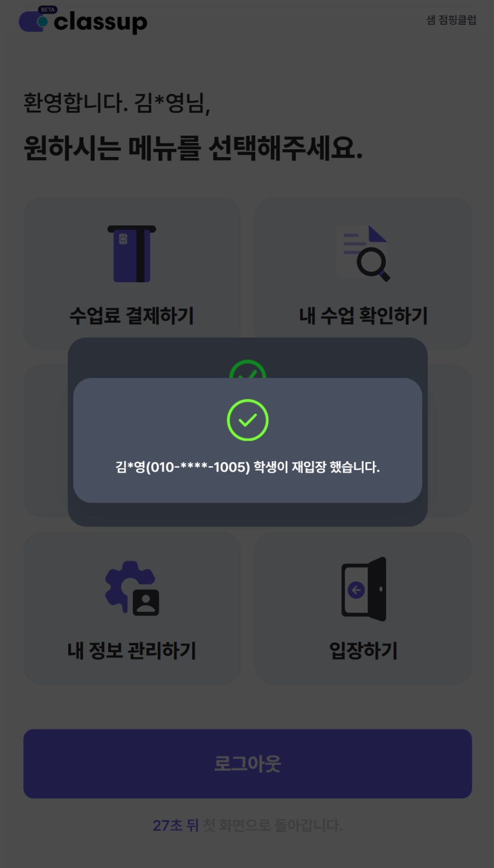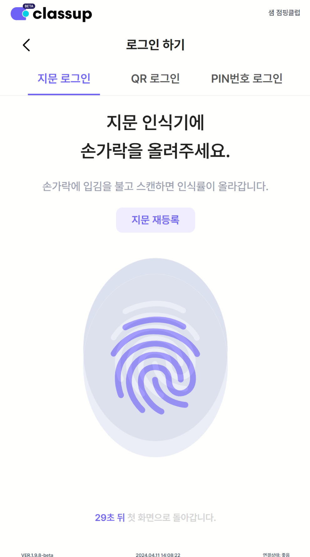 이미 지문이 등록된 학생의 경우 지문인식기에 손가락을 올리면 바로 입장 가능합니다.
