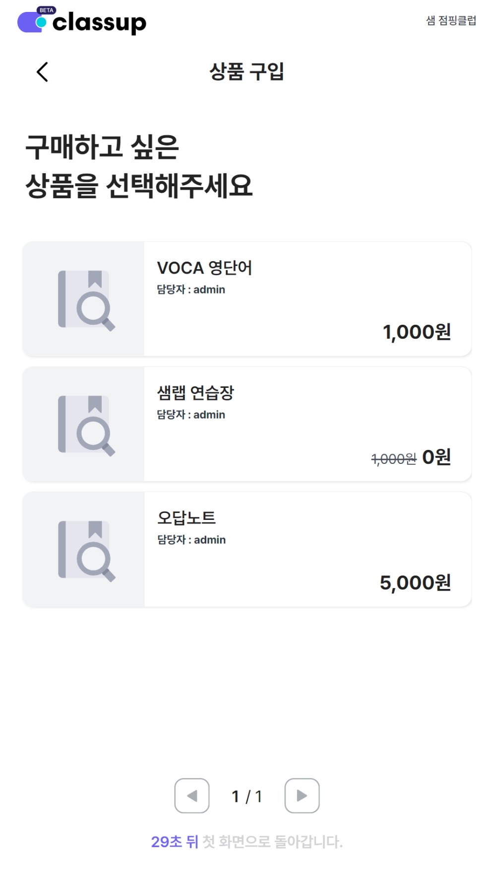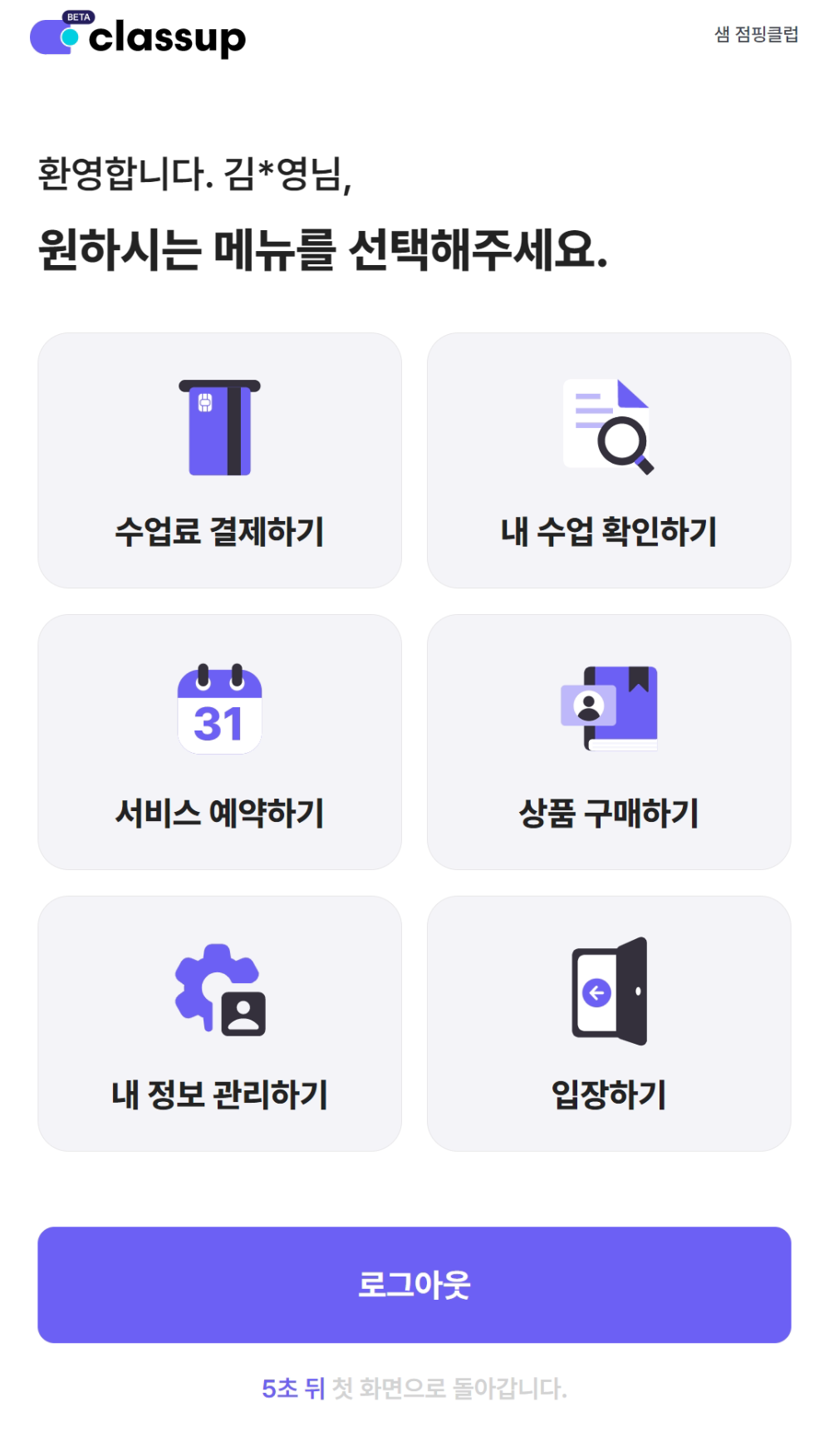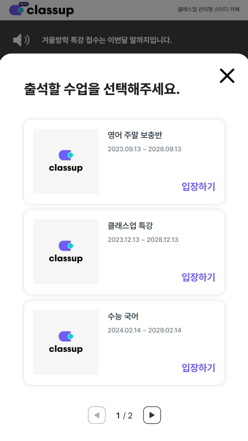 학생이 소속된 수업 목록이 표시되며, 출석할 수업을 선택하면 입장할 수 있습니다.