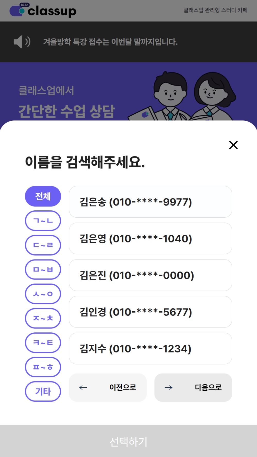 초성 검색 입장을 사용하려면 먼저 관리자 페이지 > [설정] > [키오스크 설정] > 키오스크 입/퇴장 모드 변경에서 ‘키즈 모드 / 초성 이름 검색’이 설정되어 있어야 합니다.