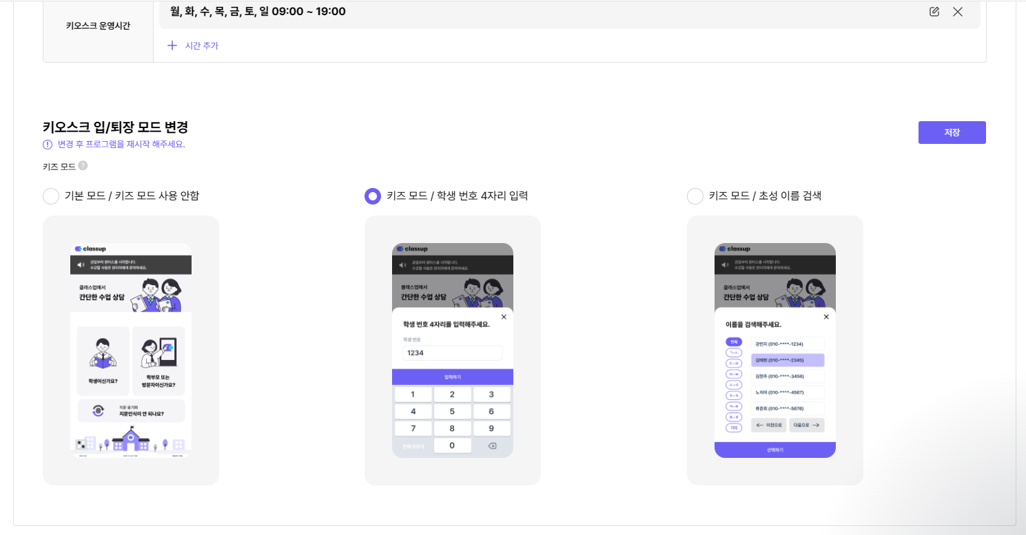 회원 번호로 입장을 사용하려면 먼저 관리자 페이지 > [설정] > [키오스크 설정] > 키오스크 입/퇴장 모드 변경에서 ‘키즈 모드 / 학생 번호 4자리 입력’이 설정되어 있어야 합니다.