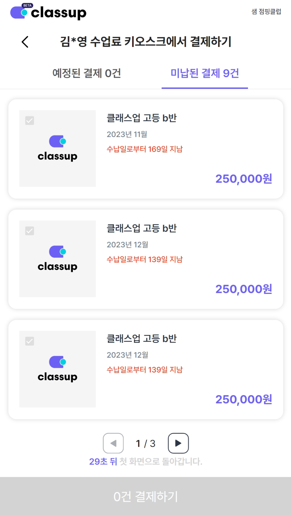 결제 예정 및 미납 수업료를 확인하고 결제합니다.