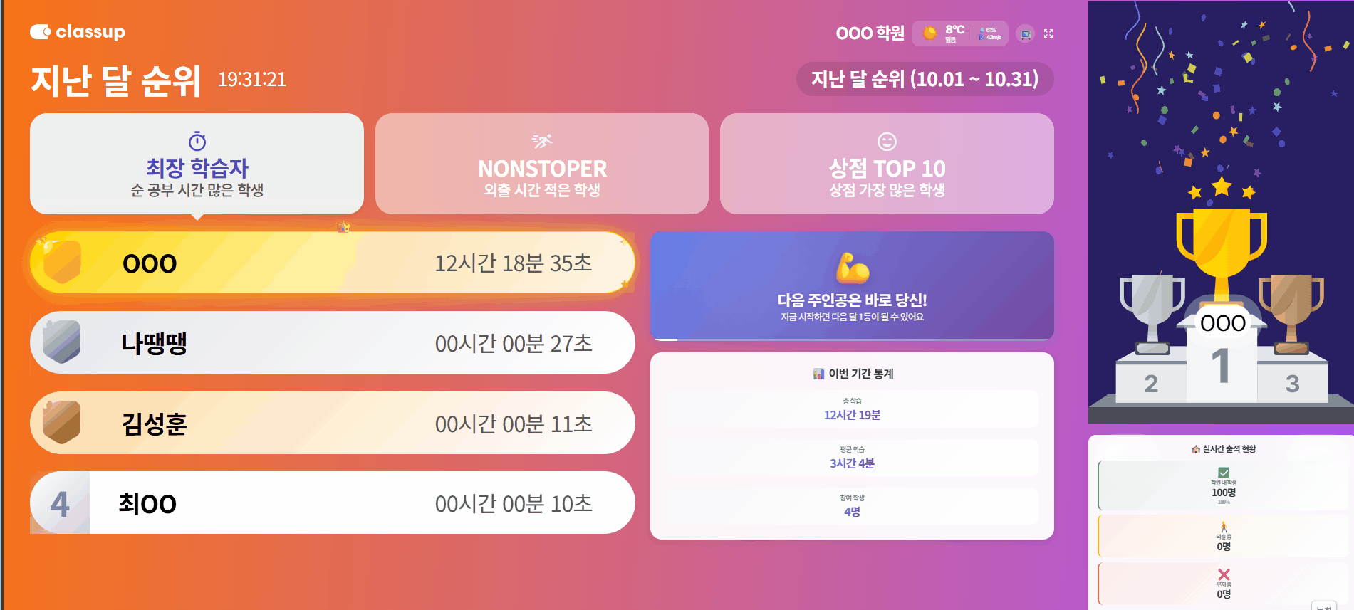 우리 학원 학생들의 순공 시간 랭킹을 대형 TV(DID)에 띄워보세요.