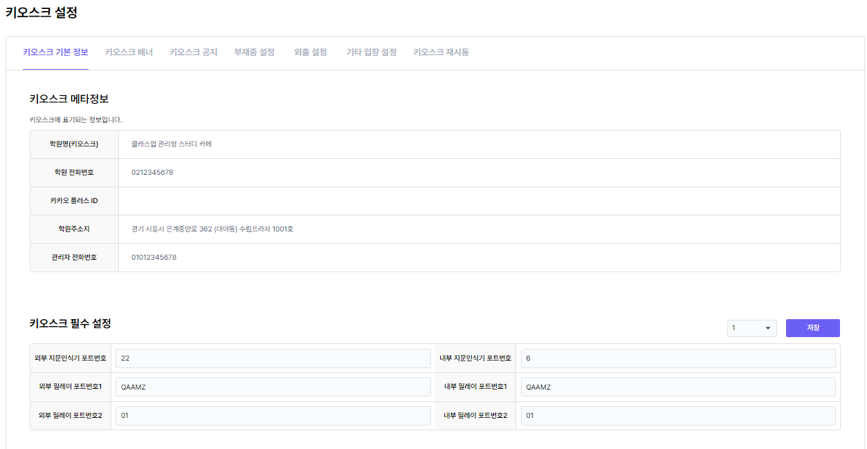 키오스크에 적용되는 지문인식기와 출입문 포트 번호를 확인 및 수정할 수 있습니다.