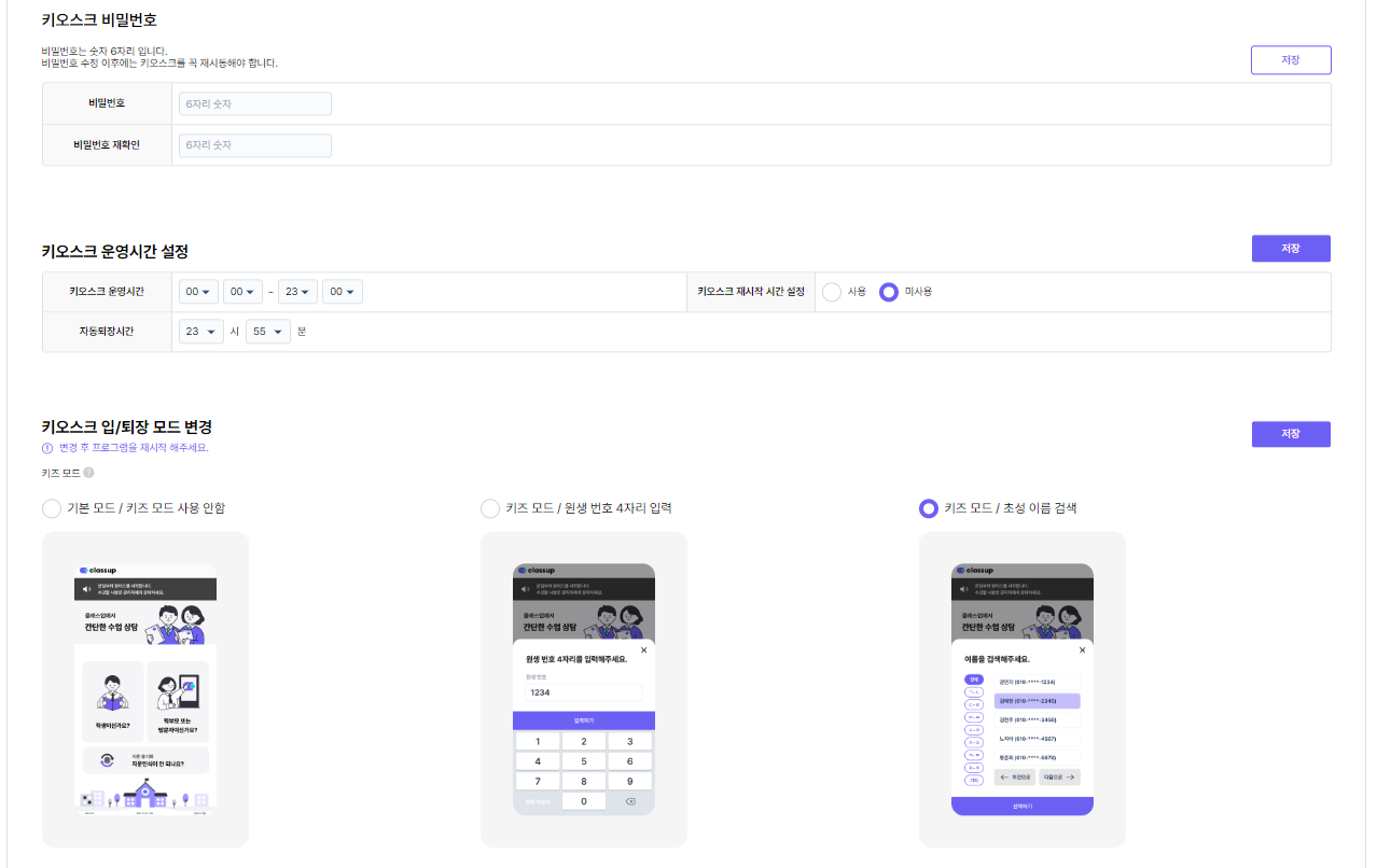 키오스크 입/퇴장에 사용할 모드를 선택할 수 있습니다.