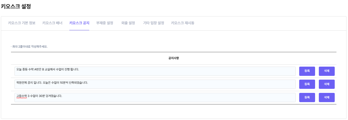 키오스크 기본 페이지 상단의 공지내용을 등록합니다.