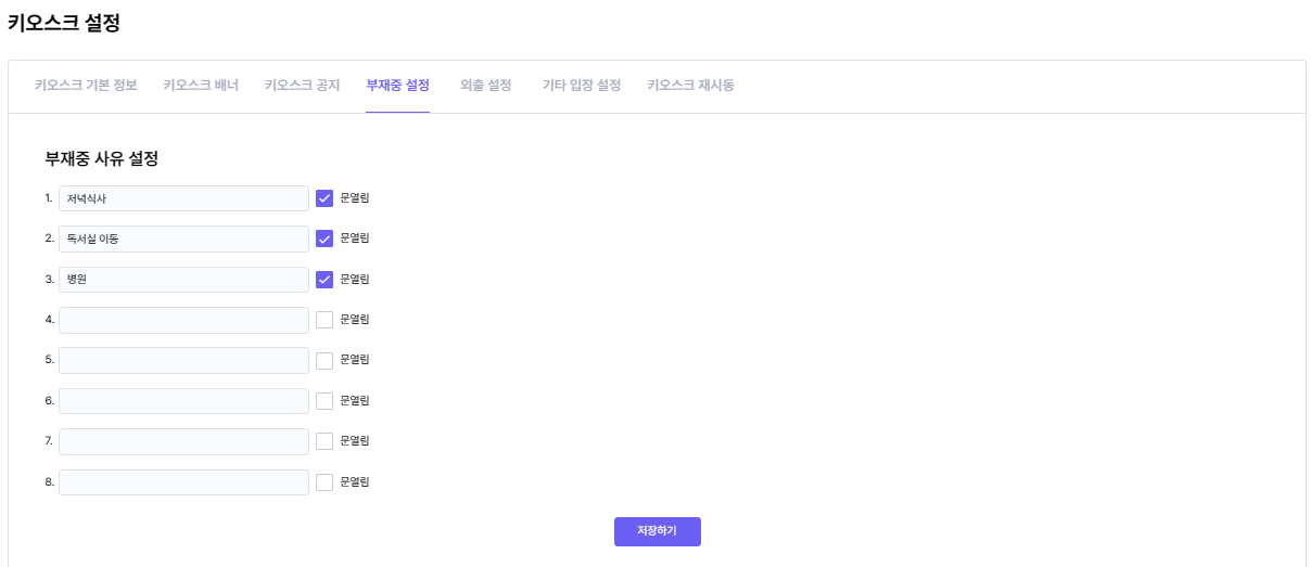 원생들의 부재중 사유를 내용을 지정하여 설정할 수 있습니다.