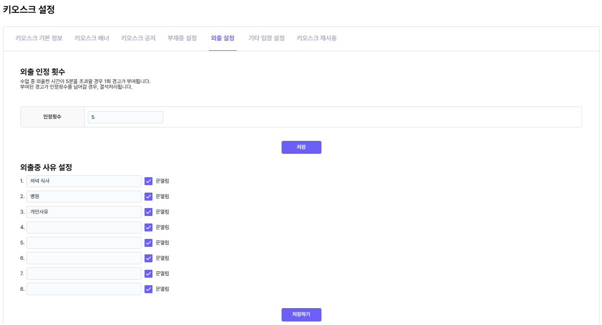 원생들의 외출 사유를 내용을 지정하여 설정할 수 있습니다.