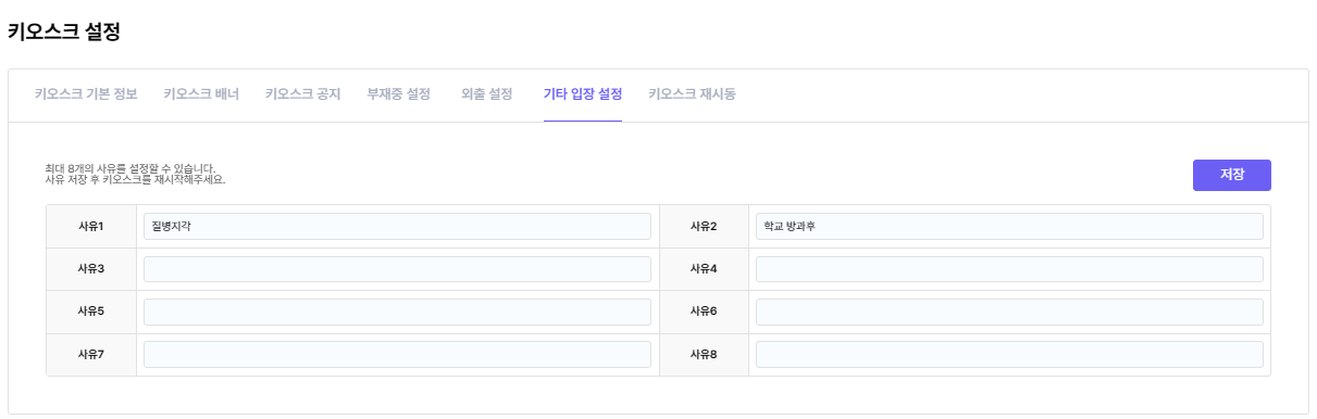 원생들의 기타입장 설정을 사유별로 지정해 놓을 수 있습니다.