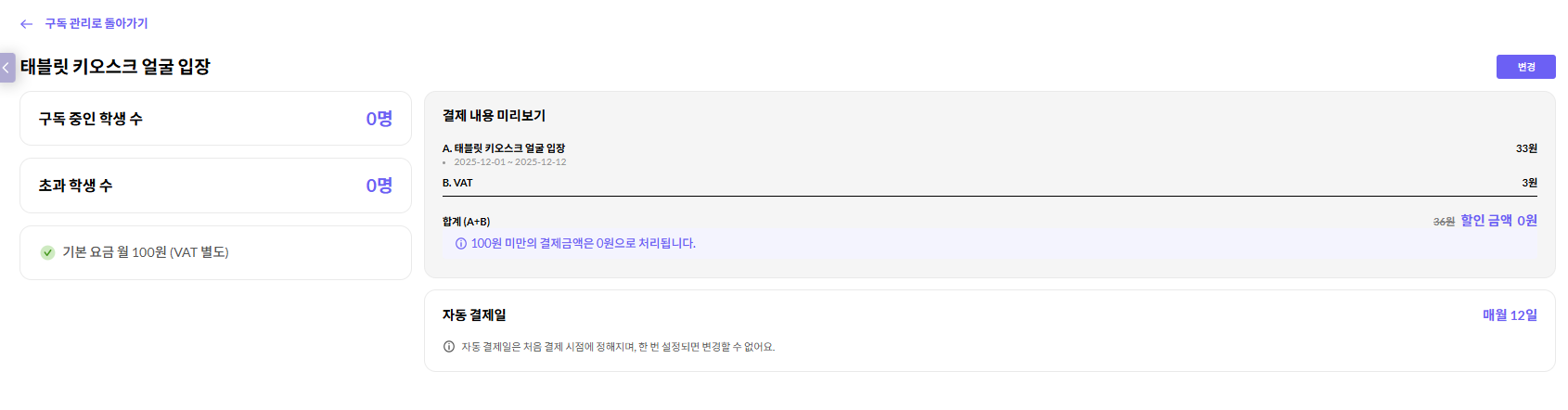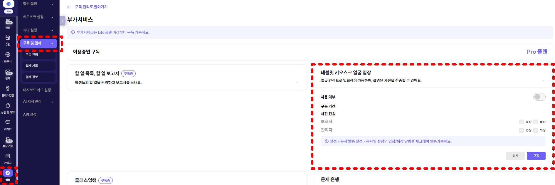 설정 → 구독 및 결제 → 태블릿 키오스크 얼굴 입장