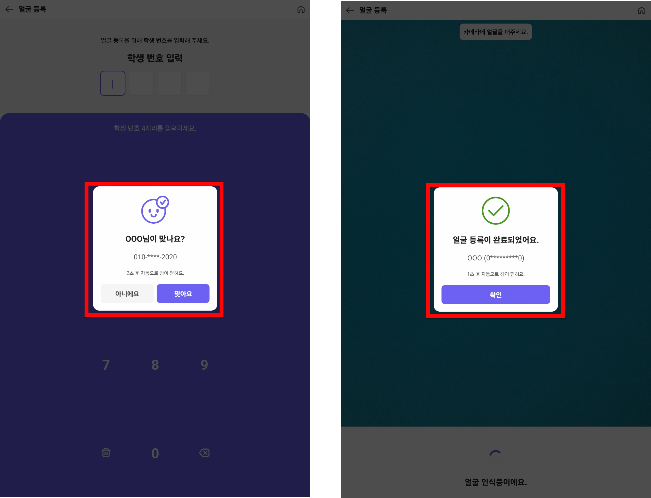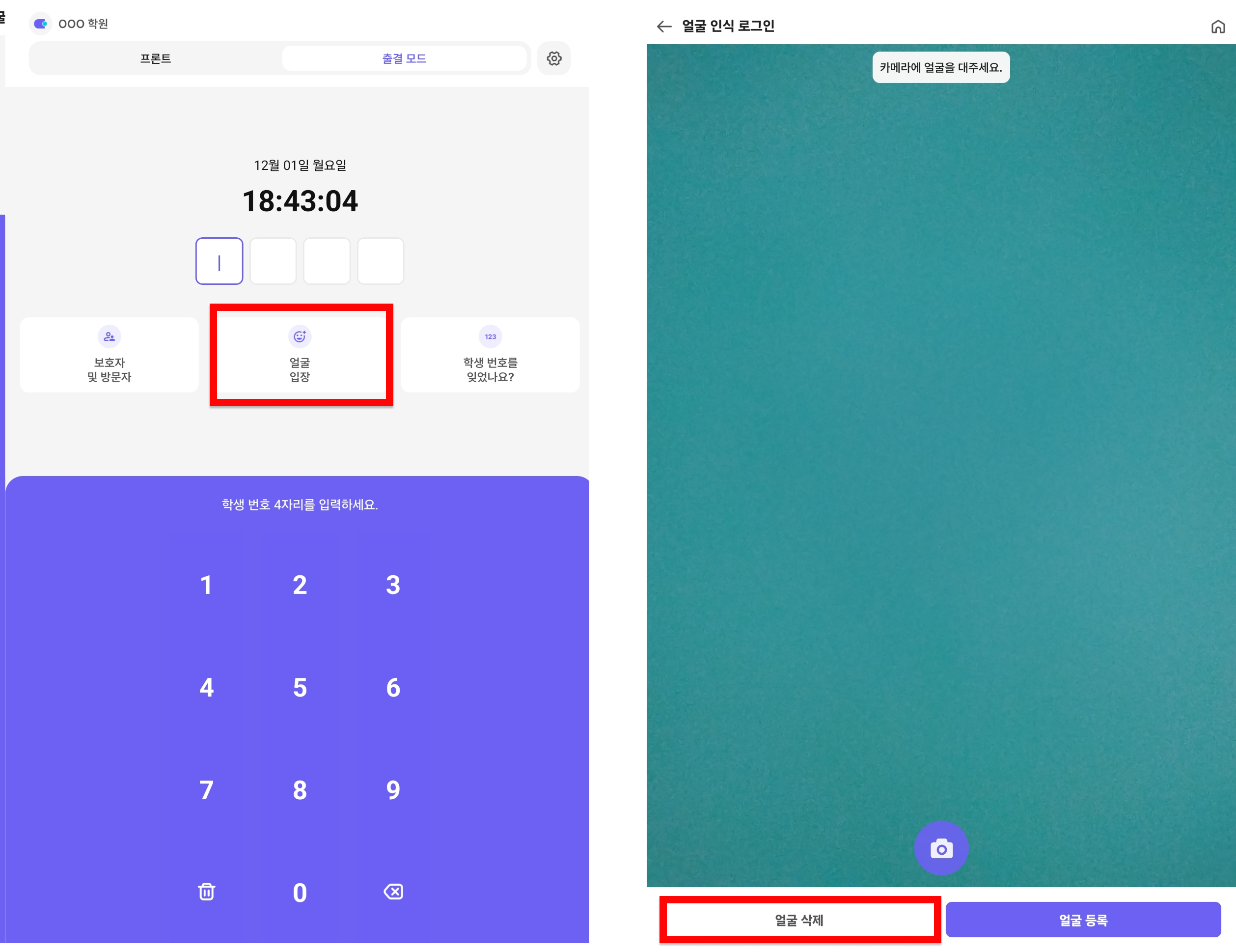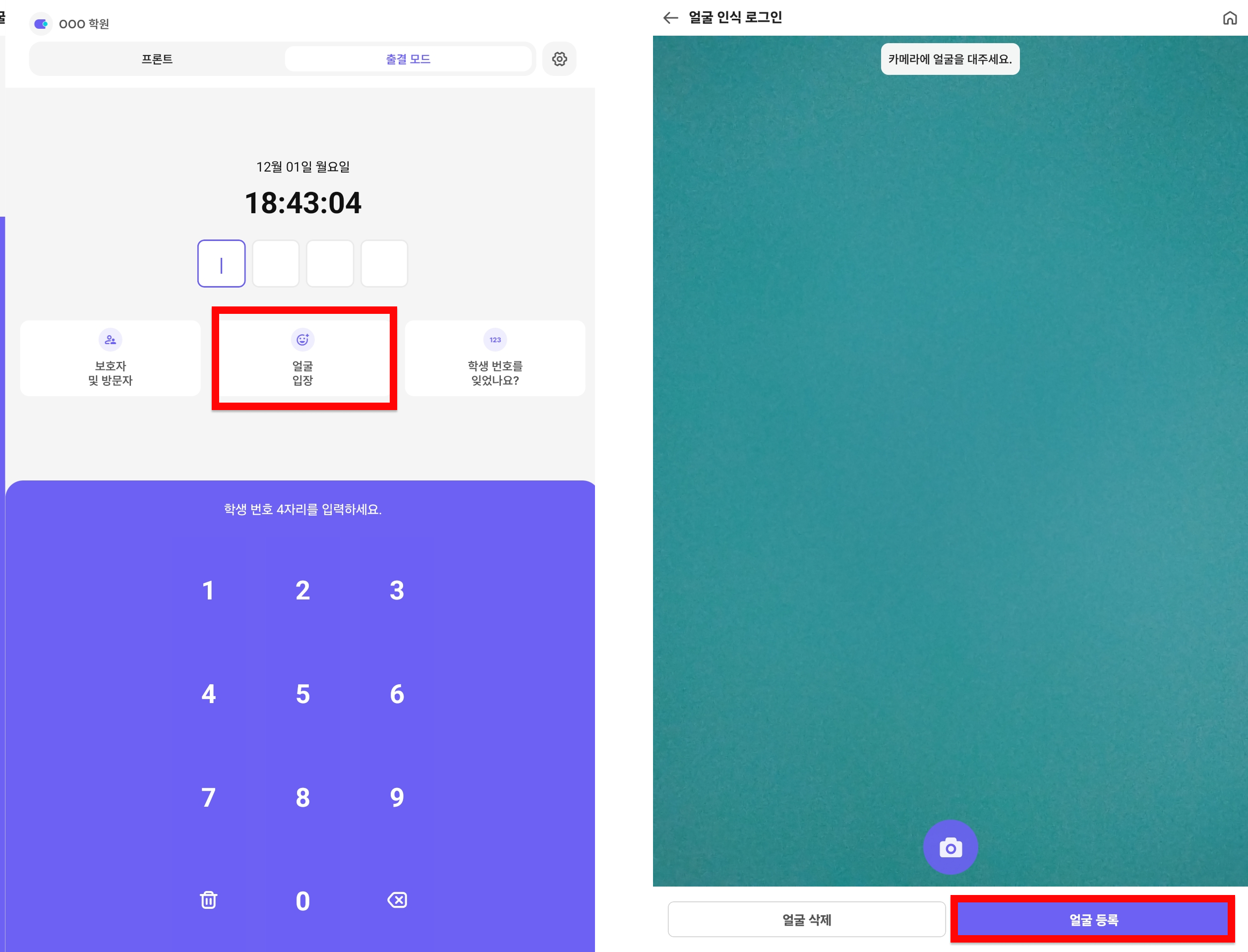 학생이 태블릿 카메라를 바라보기만 하면 끝!