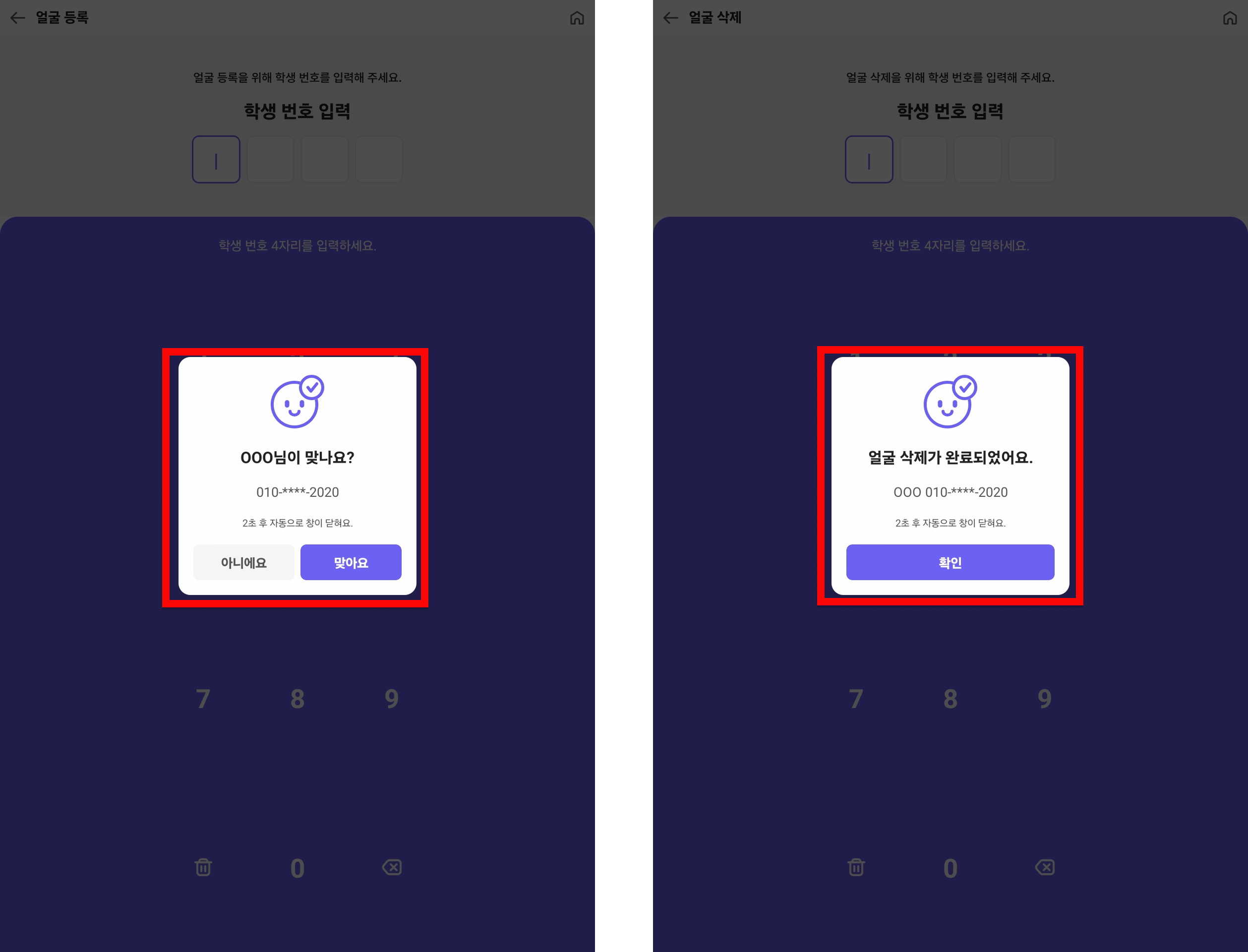 학생 번호 4자리를 입력하고 본인 확인 여부 선택해주세요