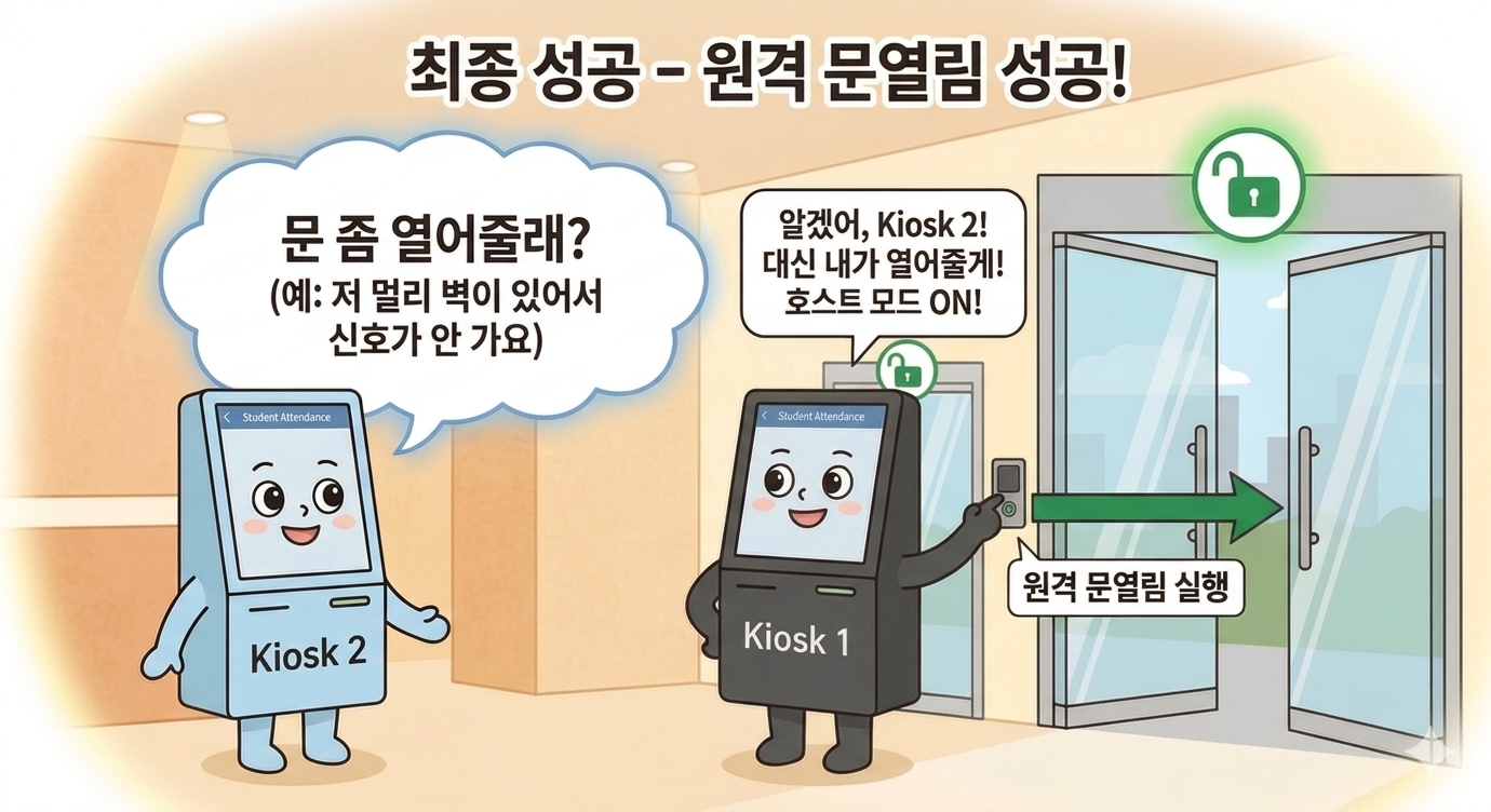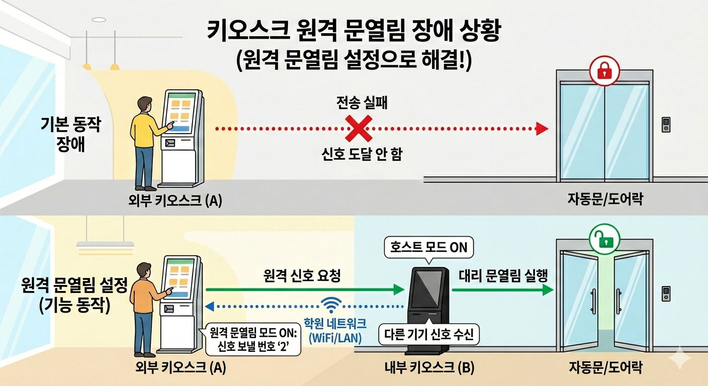 키오스크가 문(자동문/도어락)에 직접 신호를 못 보낼 때 사용하는 기능이에요. 신호를 못 쏘는 기기가 옆에 있는 다른 기기에 부탁해서 대신 문을 열게 만드는 방식입니다.