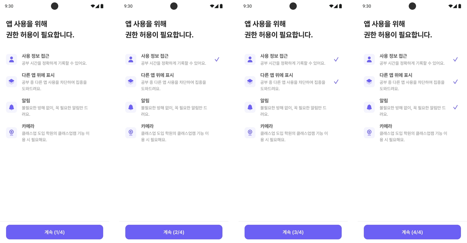 앱을 처음 켜면 권한 허용 알림이 뜰 거예요. 원활한 사용을 위해 꼭 [게속]을 눌러주세요!