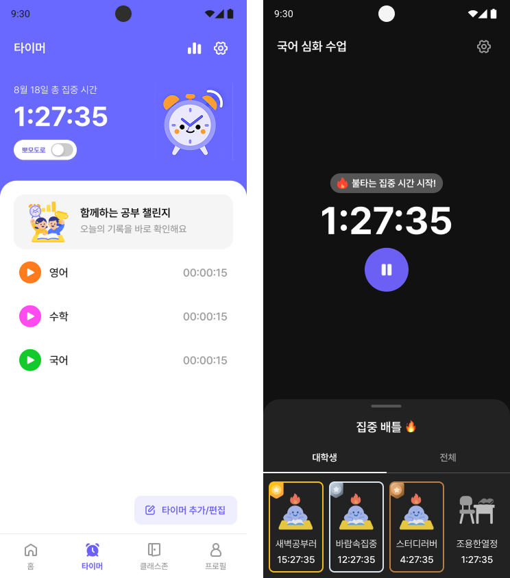 뽀모도로 모드: 집중 시간과 휴식 시간을 설정해서 효율적으로 공부해보세요.