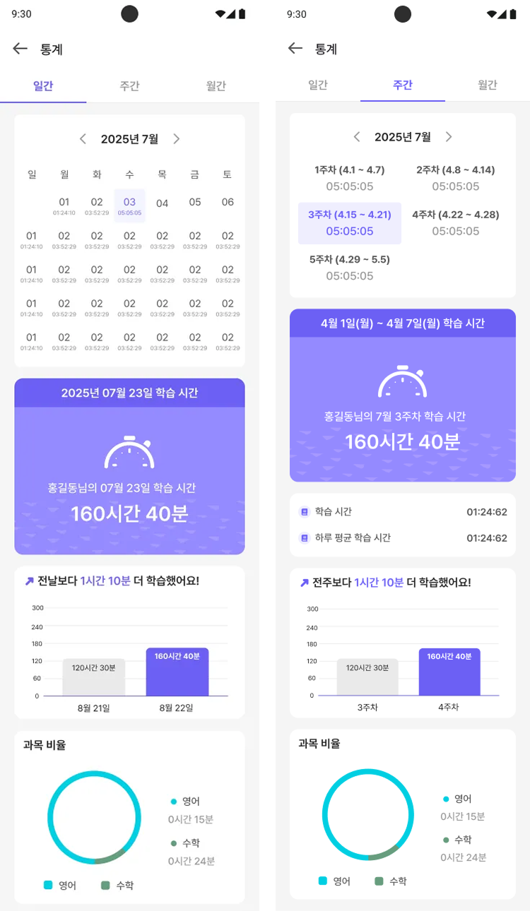 통계 차트: 일간, 주간, 월간 단위로 학습 시간 변화를 그래프로 볼 수 있어요.