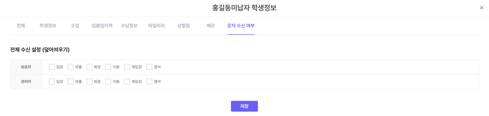 ํ์ ๋ณ๋ก ํด๋์ค์ ์ด ๋ฐ์กํ๋ ๋ฉ์์ง๋ฅผ ์์ ์ฌ๋ถ๋ฅผ ์ค์ ํ ์ ์์ต๋๋ค! ๋ชจ๋ ํ์์ ์ค์ ์ ๋ฐ๊พธ๊ณ ์ถ์ ๊ฒฝ์ฐ, [์ค์ ] > [๋ฌธ์์์ ์ฌ๋ถ์ค์ ]์์ ๋ณ๊ฒฝํด์ฃผ์ธ์.