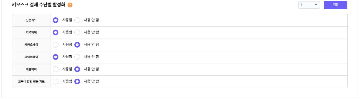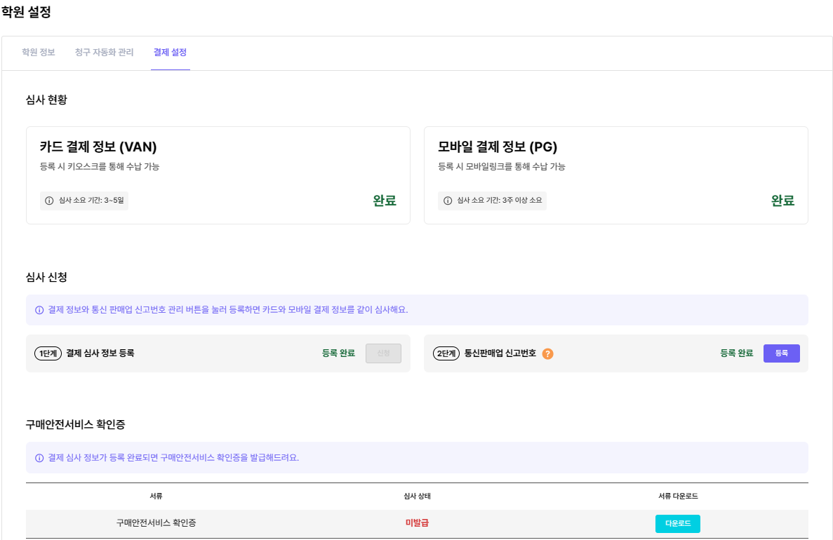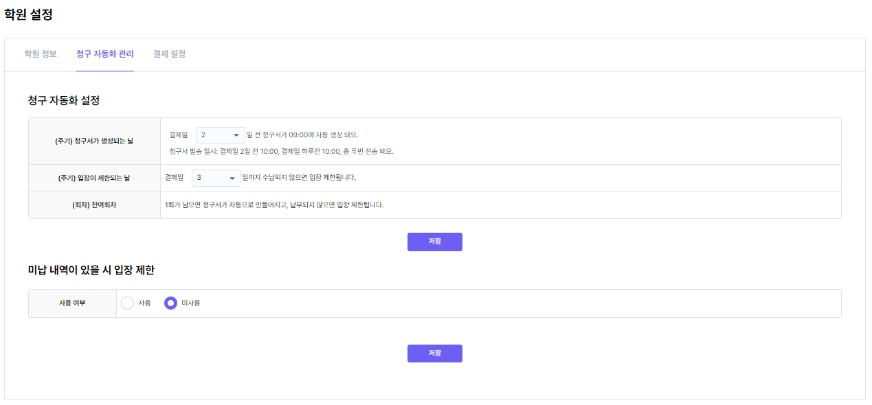 학원 정보를 기입합니다.자동 청구서 발송에 대한 설정을 할 수 있습니다.결제일까지 수납이 되지 않았을 때, 학생의 입장 제한 여부를 설정할 수 있습니다.카드 결제 정보, 모바일 결제 정보 등 결제 심사 내용을 확인할 수 있습니다.키오스크 결제 수단별 활성화를 설정할 수 있습니다.[동영상 가이드 보기]